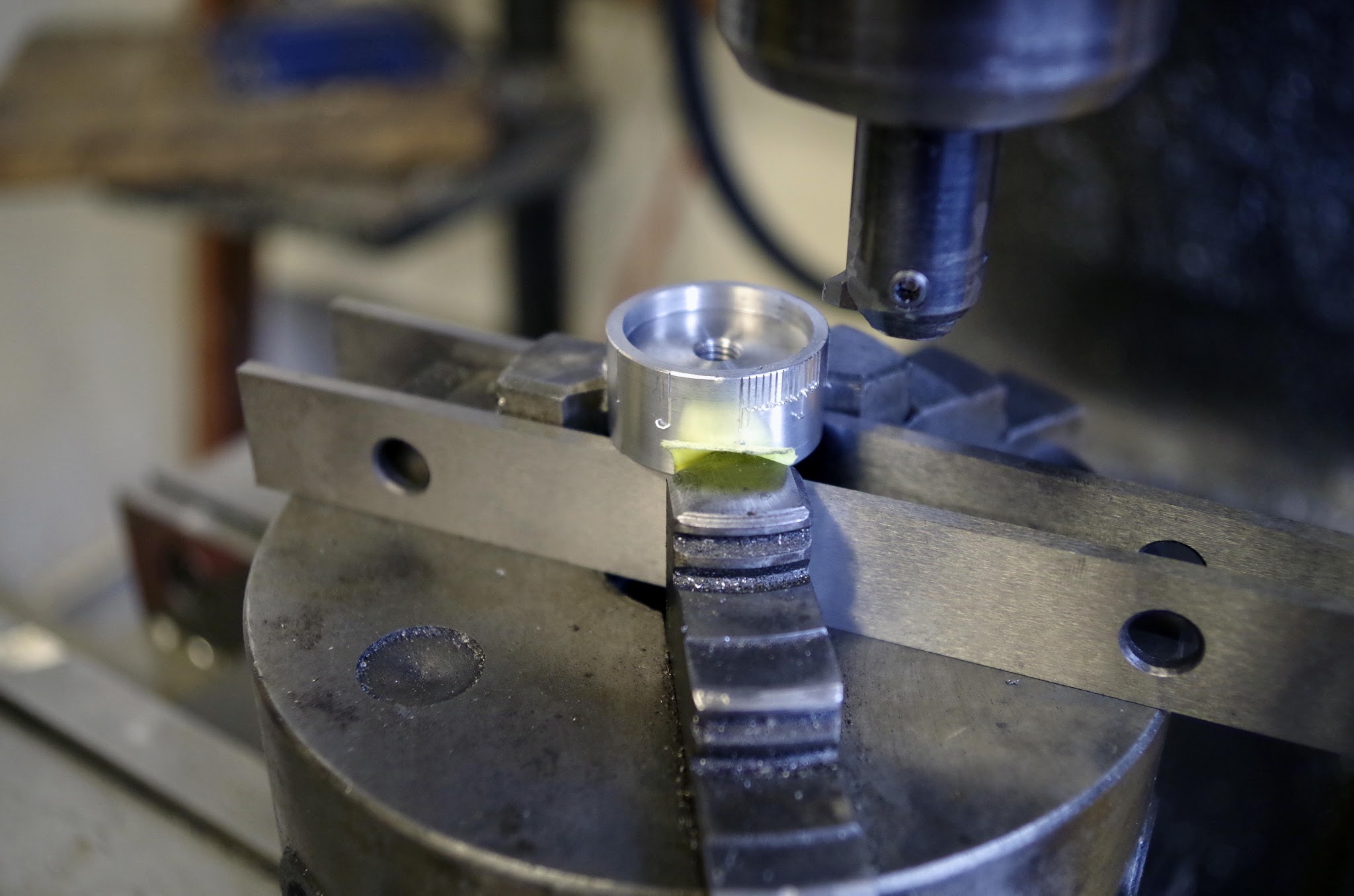 Ticks on the dial were scribed on the mill, using a single point cutter and indexing head to cut the marks. The three jaw chuck on the MTIERS indexing head doesn't hold parts very centered, so I had to shim the jaws with paper to get the dial centered properly:
