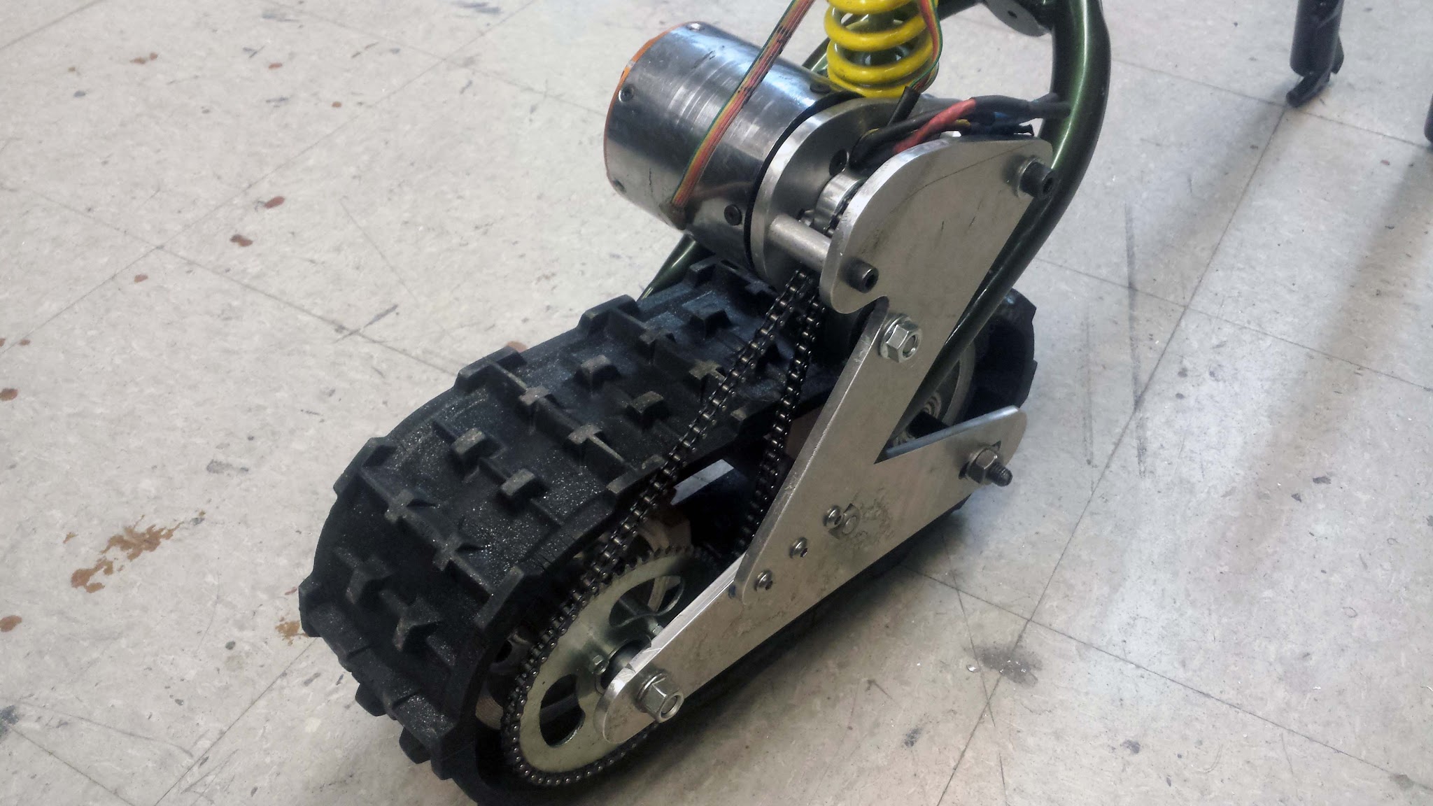 Second (and more fatal) problem was the shape of the track rollers. The tracks would quickly get filled with snow, which was compacted by the rollers and clogged the teeth. This stopped the track from engaging properly, and caused it to bind. I think the answer is to just remove most of the width of the teeth, so that there's space between the teeth and the matching part of the track. A bigger gap should make it much more difficult for snow to collect and jam things up.