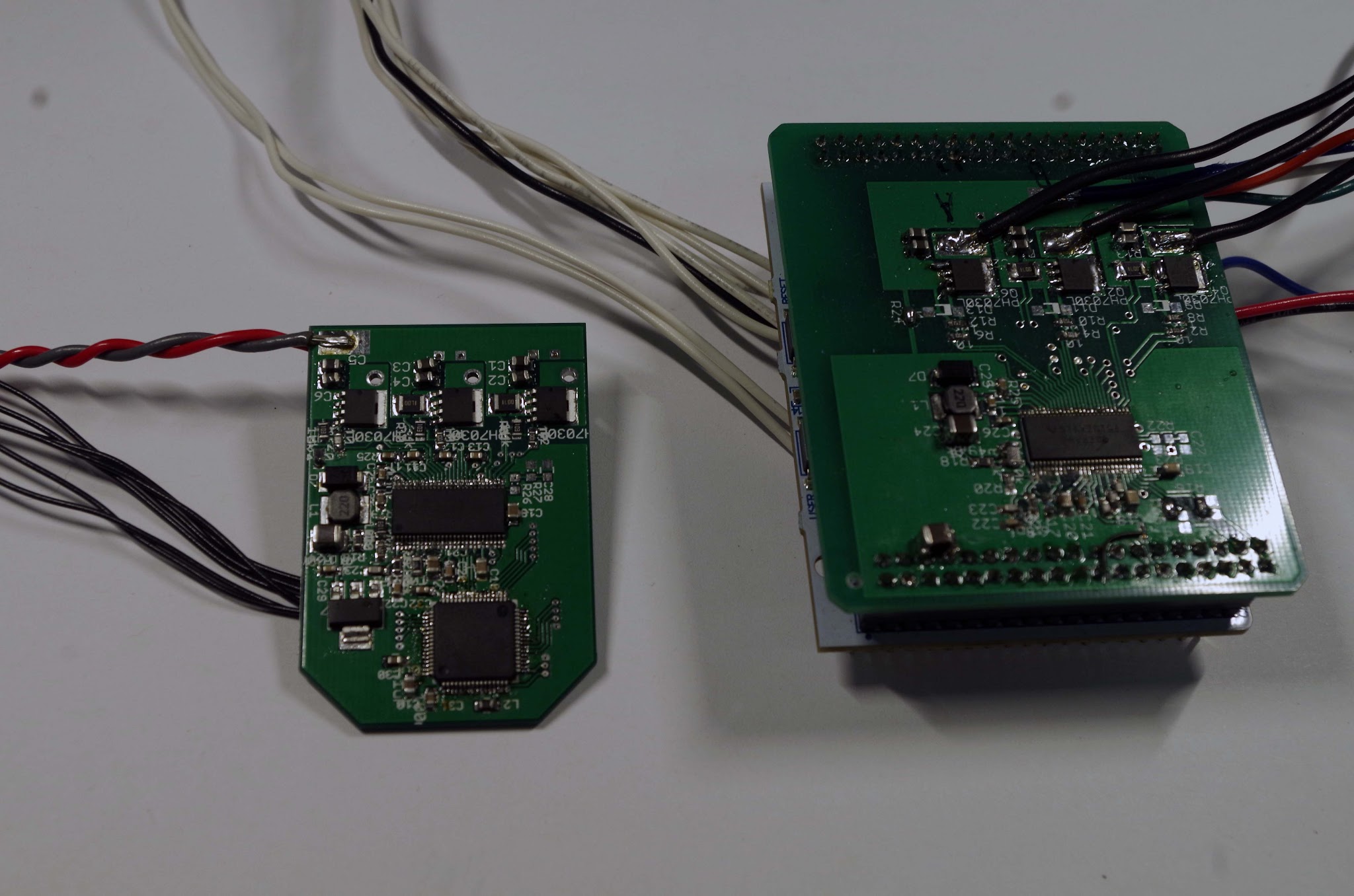 Controller next to a motor. I strongly considered making the controller the same footprint as the motor, so it could be directly bolted on the back of the motor, but ended up not. Maybe I'll do that for version 3.