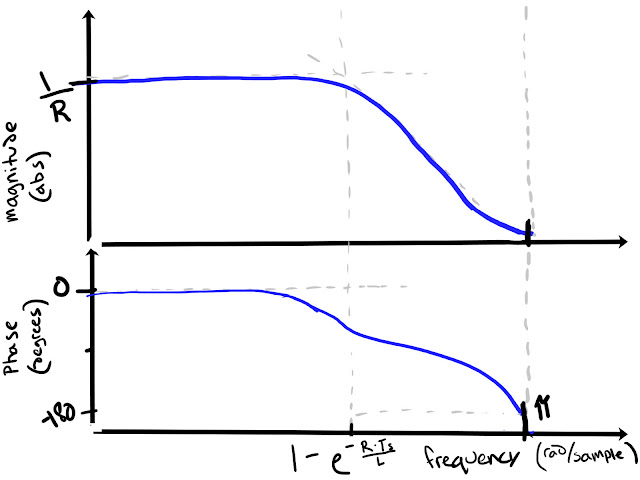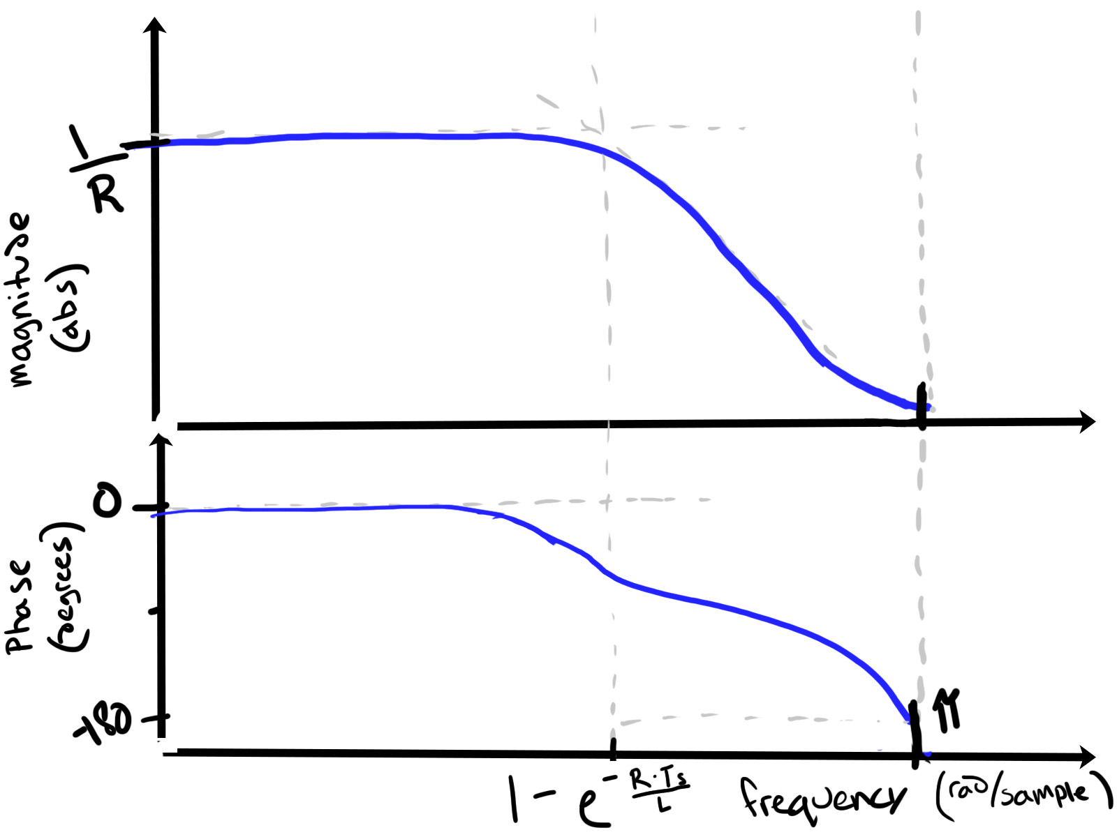 Where R and L are the same resistance and inductance as before, and Ts is the sample period. The frequency response looks a lot like the continuous time version, except that the phase (and magnitude, but to a lesser extent) gets kind of wacky towards π radians/sample.