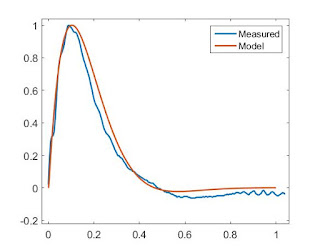 Here's the disturbance response (i.e. me flicking the pendulum) of pendulum angle with two different controllers, as compared to the model used to come up with the controller gains.