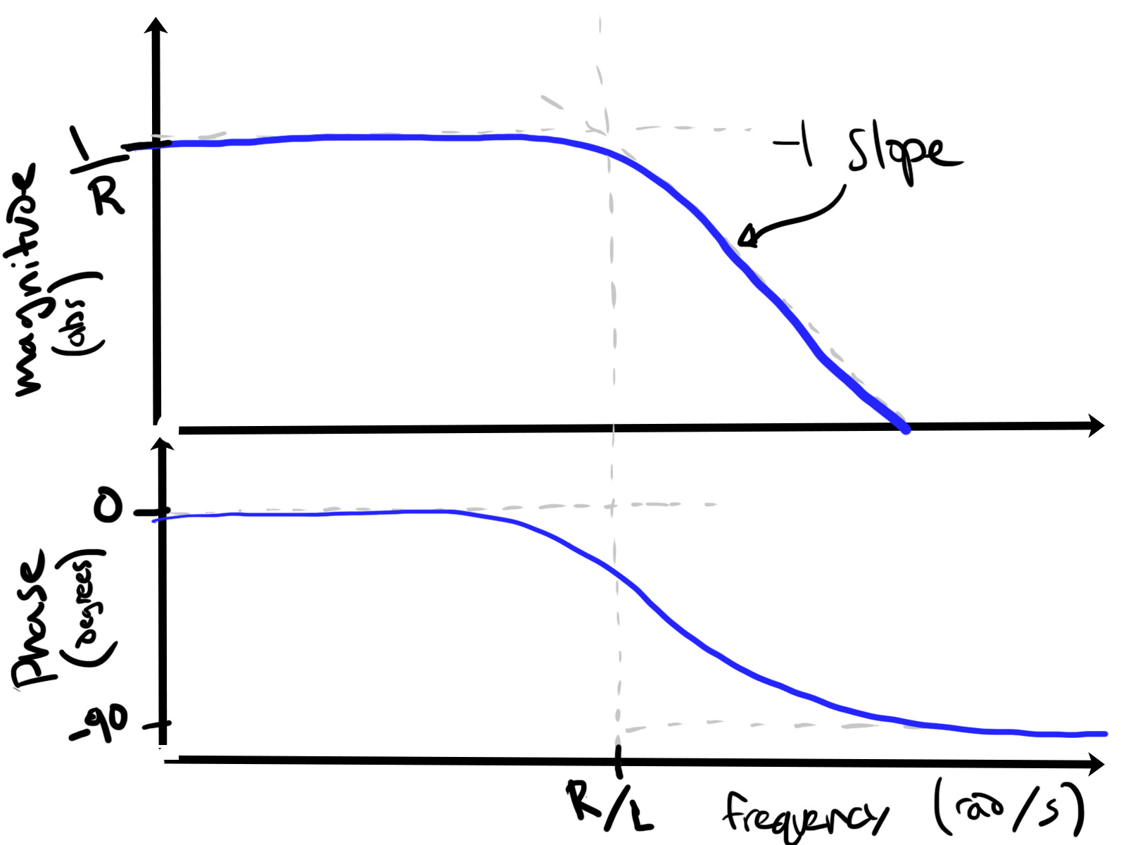 Remembering good ol' 2.004, the transfer function of a series RL circuit from voltage to current is $$\frac{I(s)}{V(s)} = \frac{1}{(Ls + R)}$$ which has a frequency response like this: