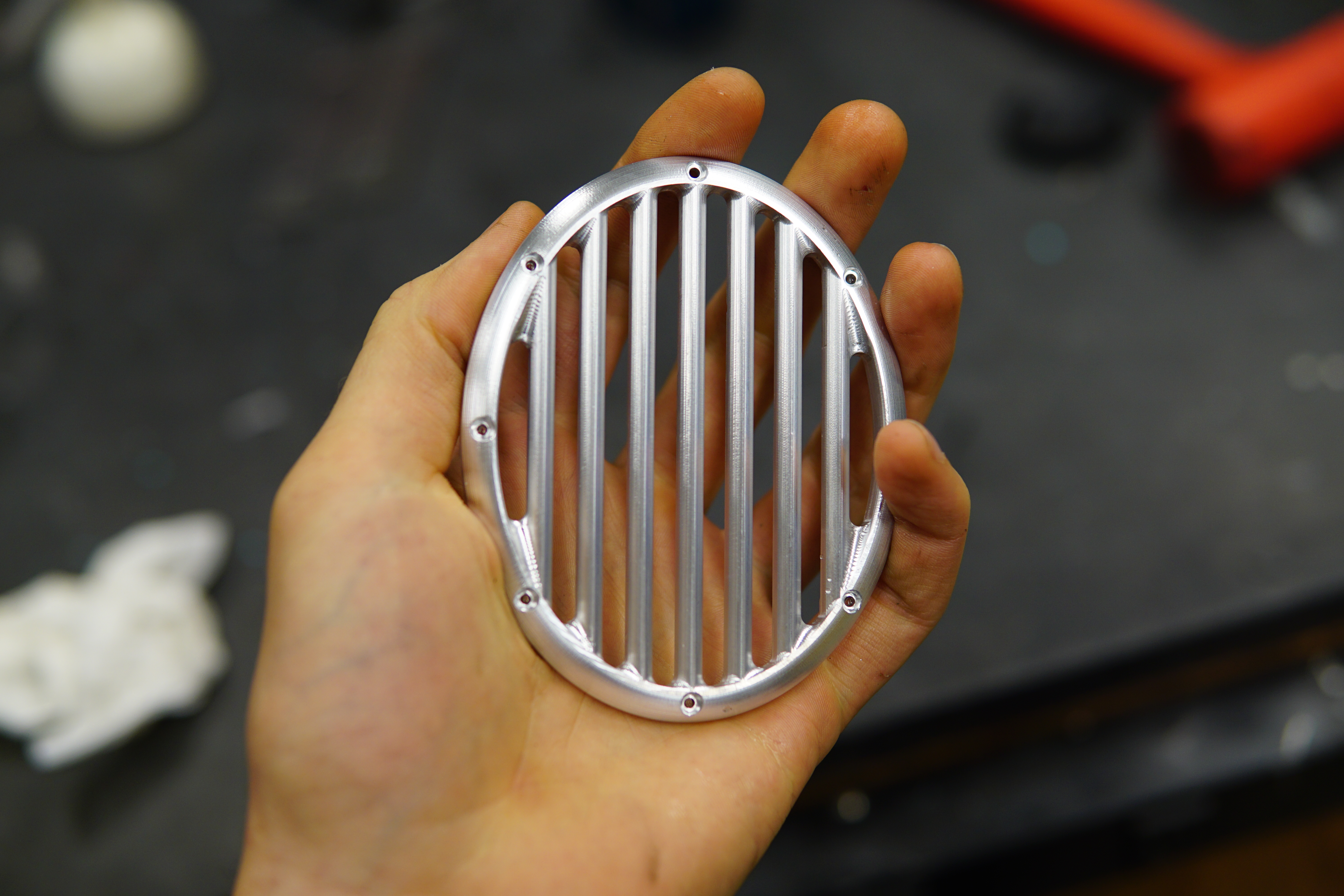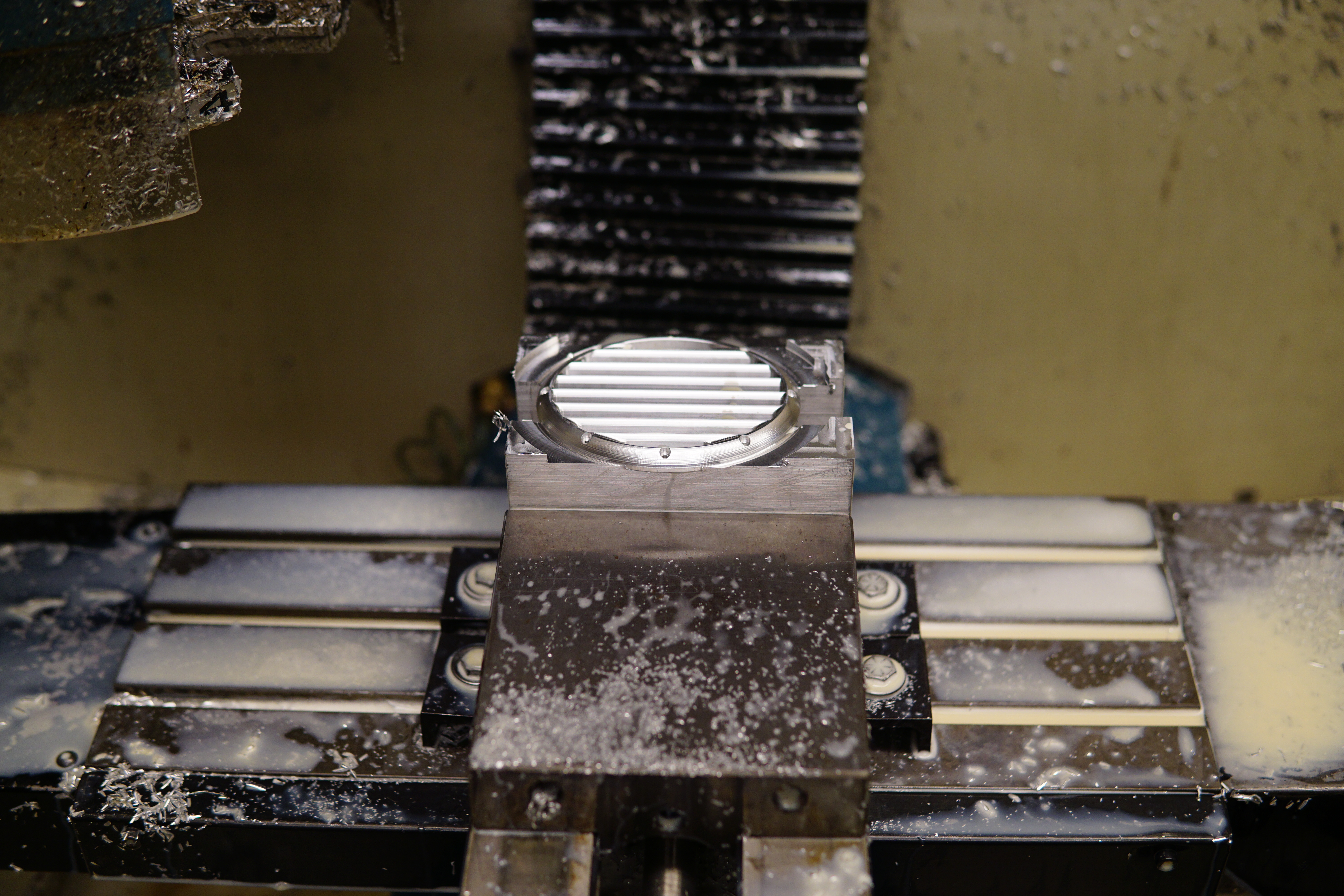 The machining was done in two operations. All the fancy 3d profiling was done with the part flipped over and held in soft jaws.