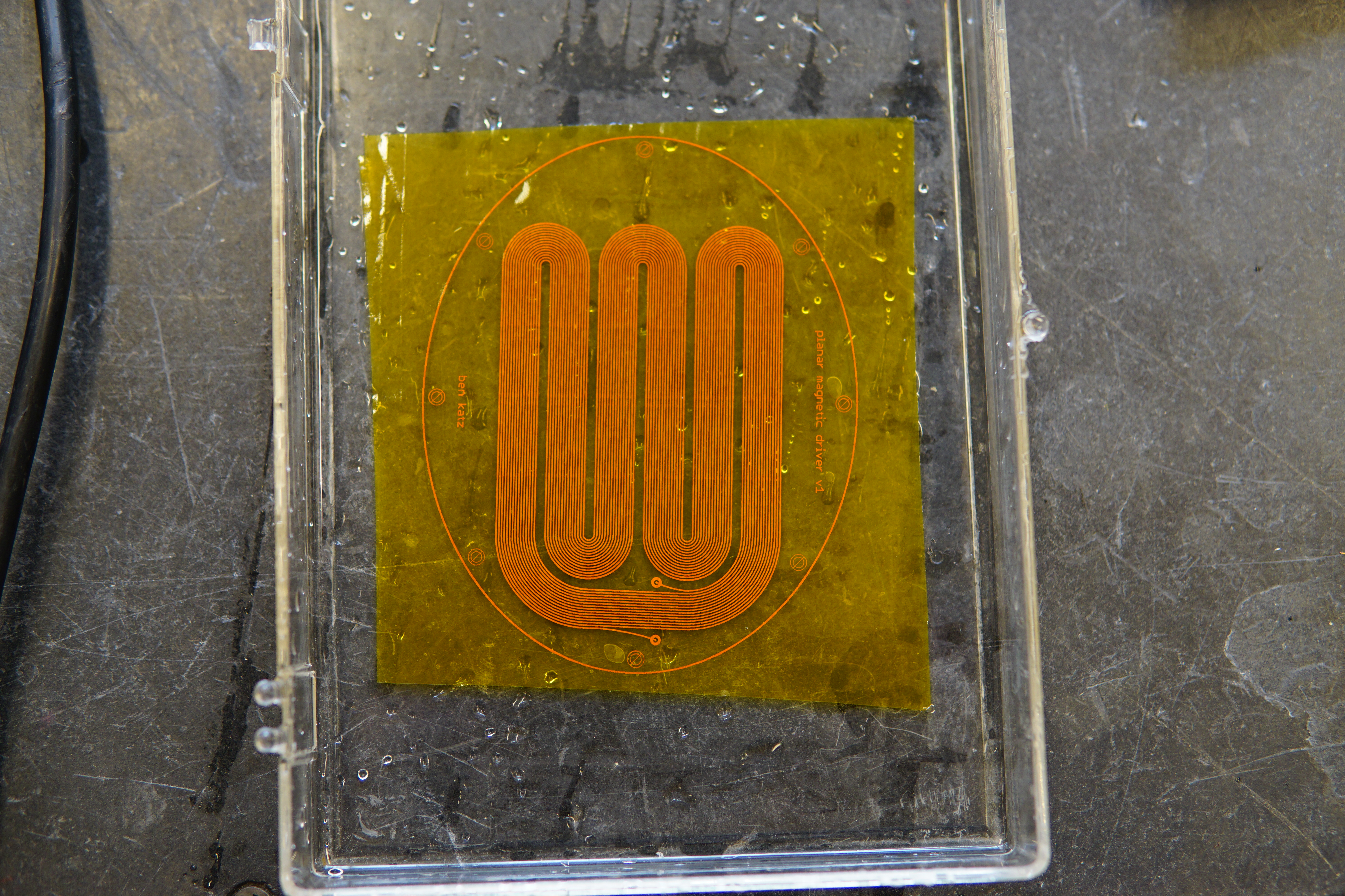 This one sounds much, much better, although there's definitely still a little weirdness going on. Listening to it plugged into a function generator and sweeping frequencies, the low-frequency resonance is gone, and over all it's much flatter, but there are still some strange notches in the response. Unfortunately I don't have a good setup for quantifying the frequency response at the moment, but it's definitely a little off right now. But it's getting better. I'm hopeful that the even thinner flex pcb material will improve the situation further. Reducing tension in the membrane might help as well.