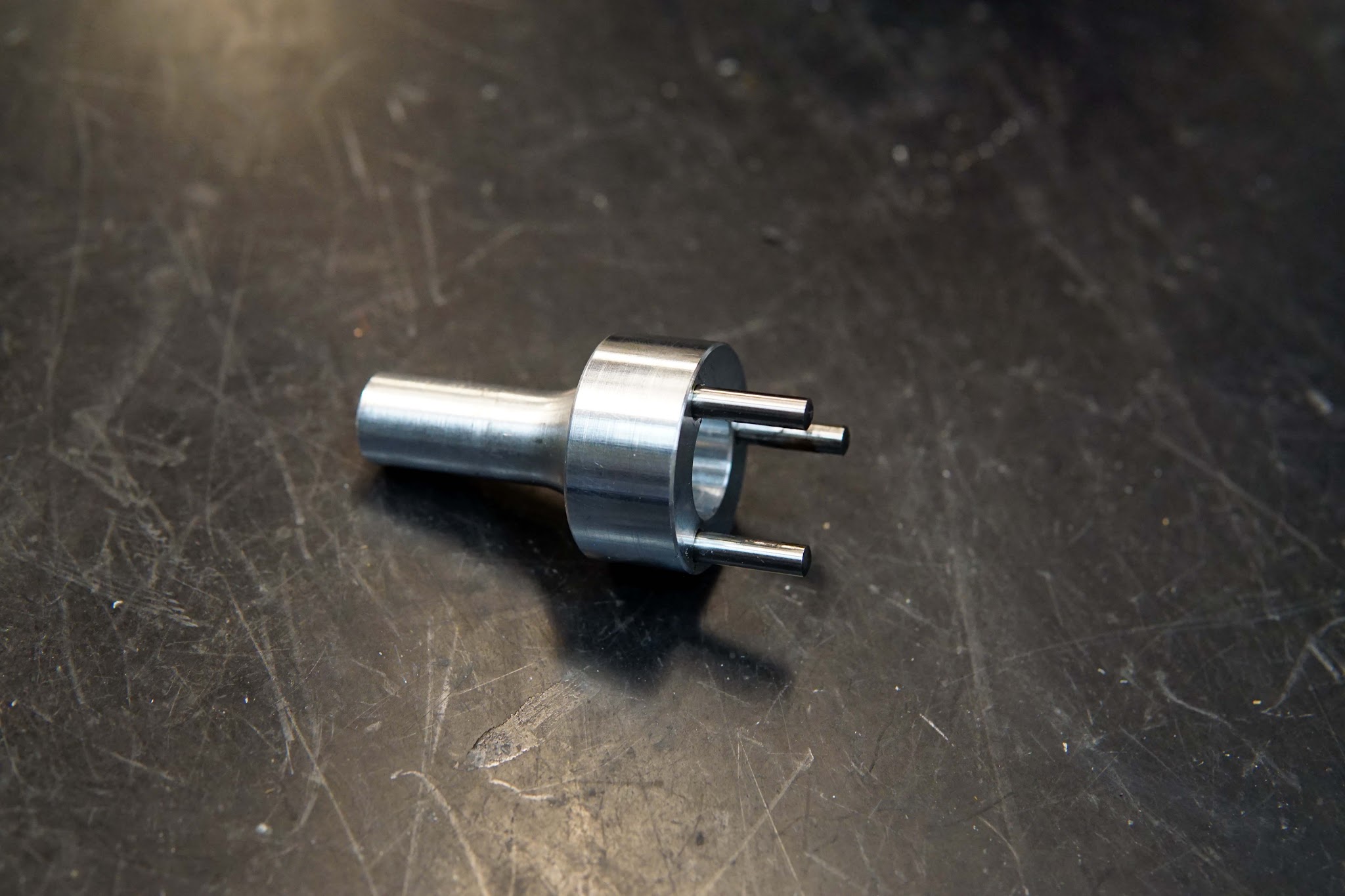 The motor had basically no shaft to speak of - it has a left-hand threaded stud on the end, and 2 flats which engage with a stamped #25 chain sprocket. Since there wasn't enough shaft to grab onto with a collet, I made a "terrorist coupling", with three steel pins that engage with the sprocket teeth: