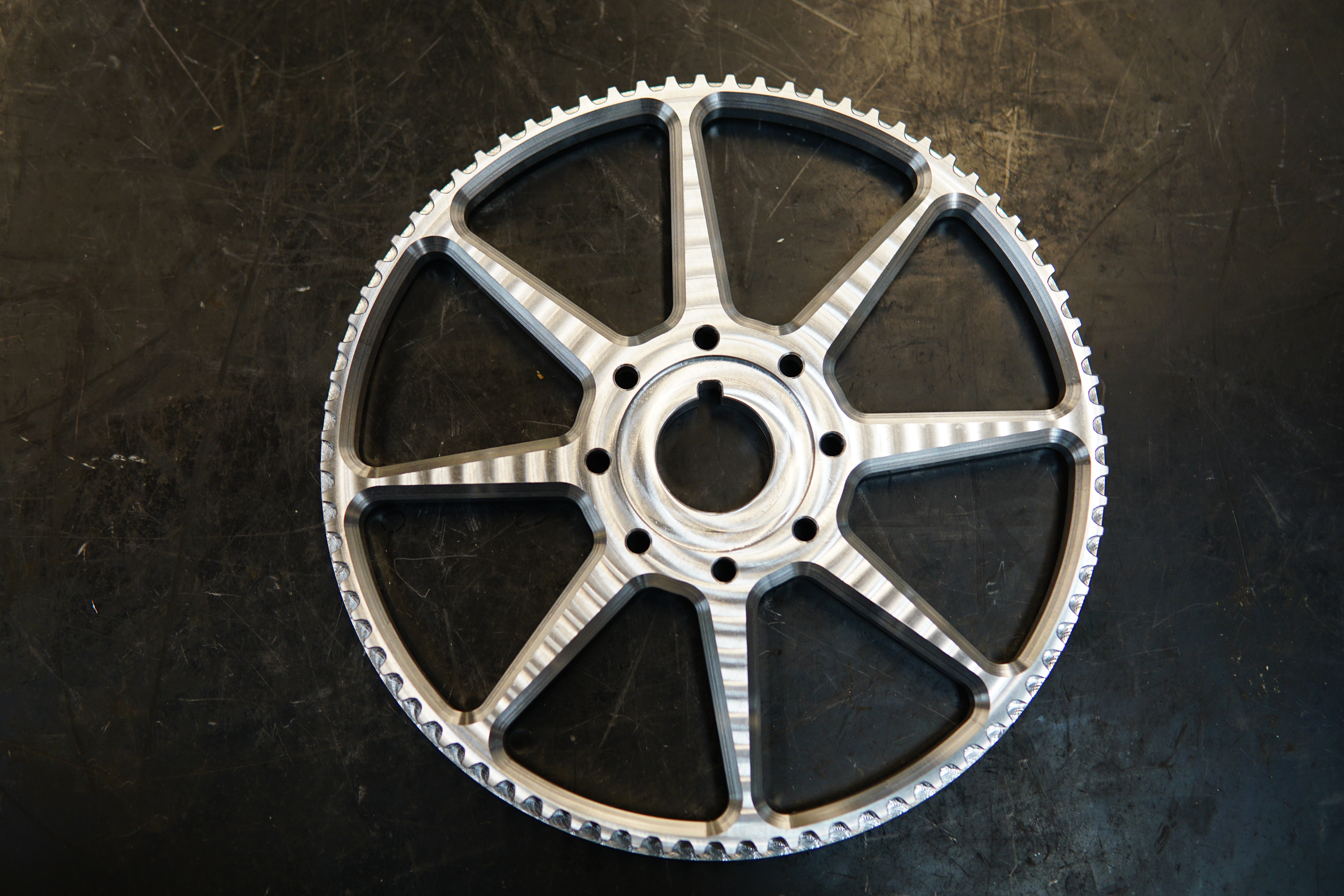 The motor-side sprocket was done on the MITERS CNC. I still need to broach the keyway in it, and turn a clamping hub for the big sprocket.