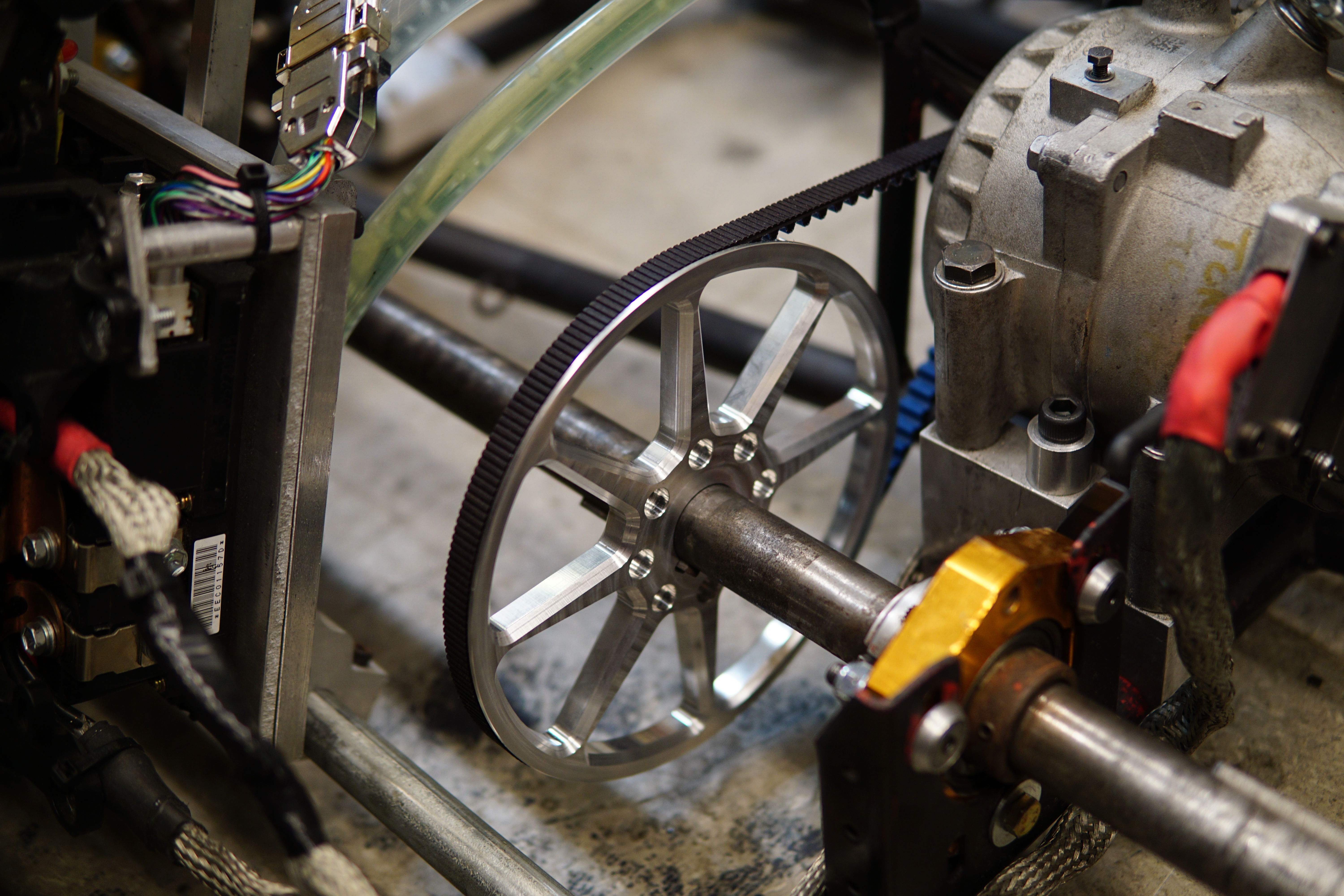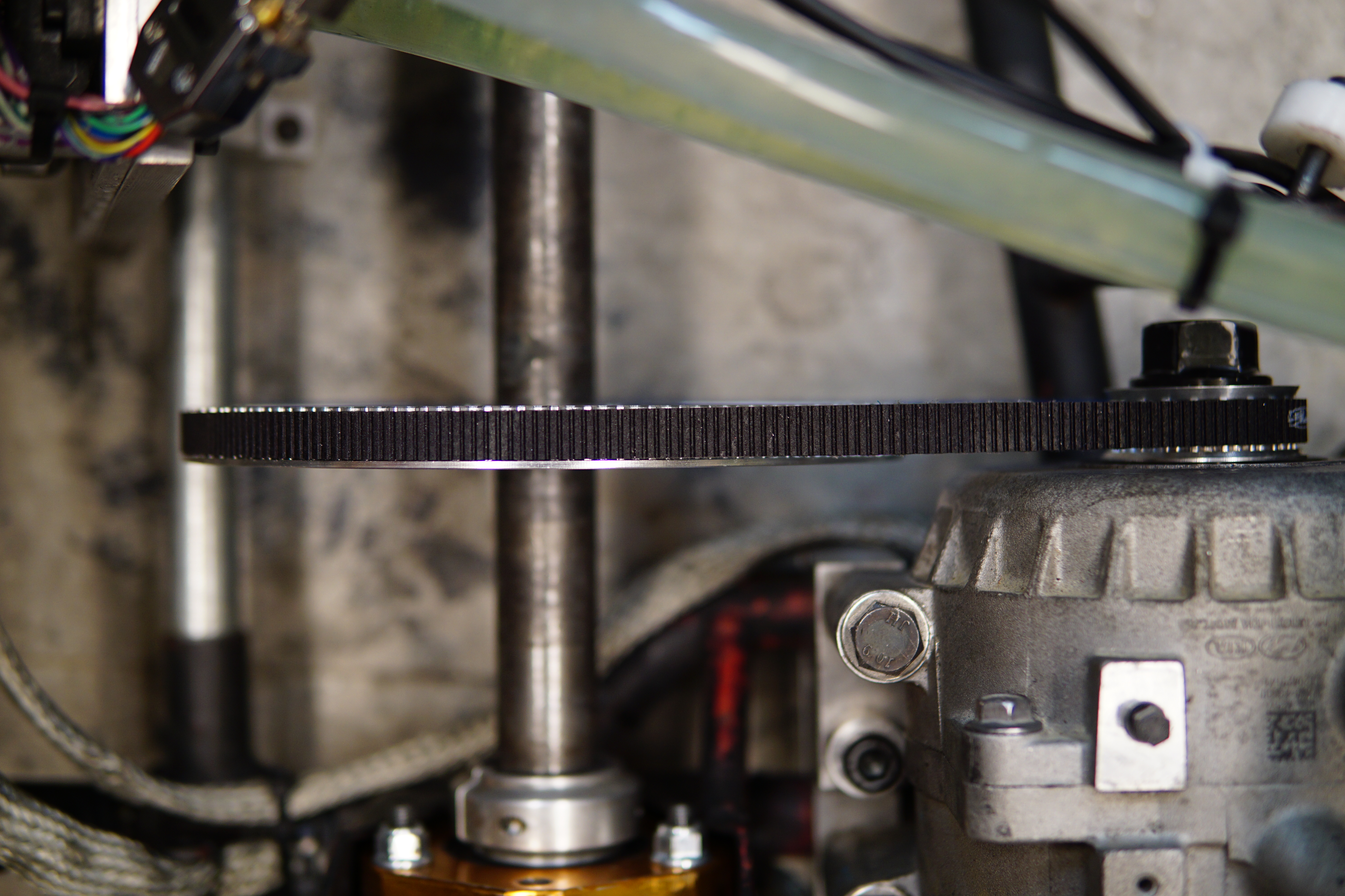 Right now the go kart uses Gates Micro-V belts, because the HSG's come with those pulleys pre-attached. However, we're driving the motors a fair bit harder than the car they came from did. The v-belts, even with a huge amount of tension, slip at ~45 N-m of torque, and we've been able to hit nearly 60 N-m at 180 phase amps. So we're switching the kart over to Gates PolyChain GT Carbon belts, which are basically the best synchronous belts you can get. The inch wide Micro-V belt is getting replaced with a 12mm wide, 8mm pitch PolyChain belt, which should be good for substantially more torque.