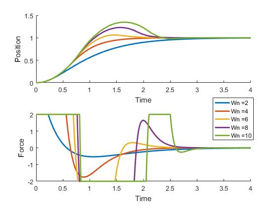 Here's what that looks like, with gains chosen such that all the closed-loop responses are critically damped. The legend shows the closed loop natural frequency. As that increases, response gets faster and faster, but the force required also increases.