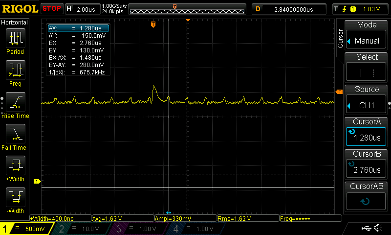 Zooming in: There are also smaller pulses at 675 kHz. That's almost certainly the switching frequency of the buck converter on the DRV chip: