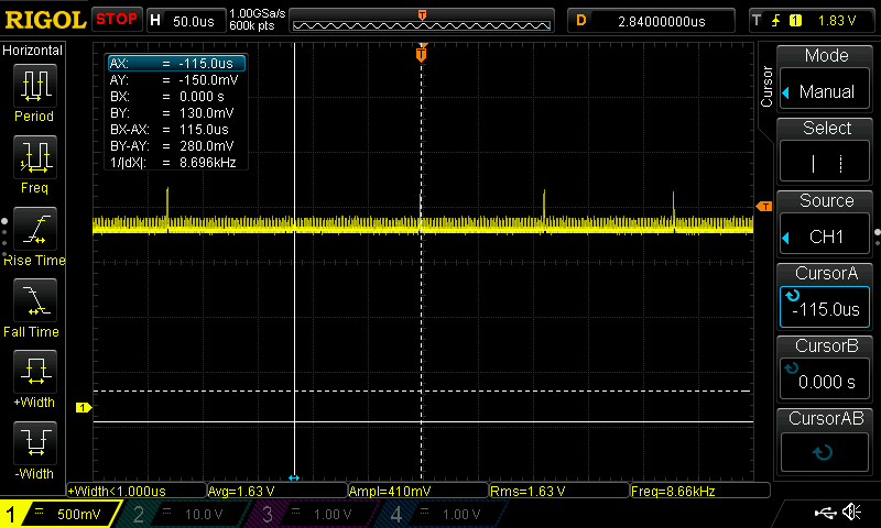 And the noise appeared. For these measurements, the Rigol didn't really have the resolution, so I broke out the Yokagawa DL708E, which has 8 isolated channels with 12-bits of resolution (4 bits more than the Rigol).