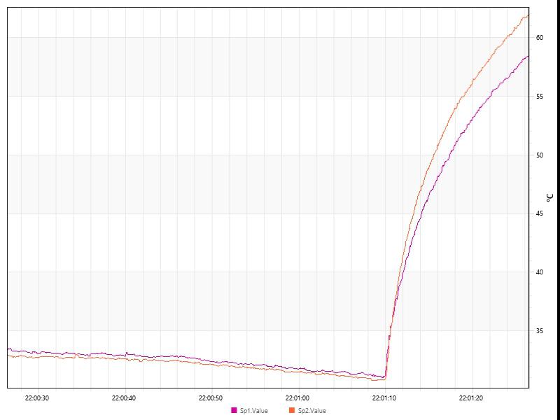 Performance was greatly improved, but there's still a ~7 degree C difference between the hottest and coldest FETs. Furthermore, in the middle of the board, the low-side FETs are several degrees hotter than the high-side FETs - traces Sp3 and Sp2 respectively on the plot below: