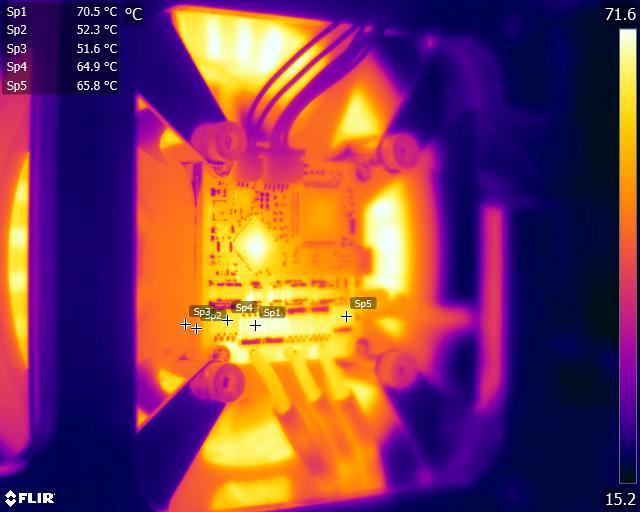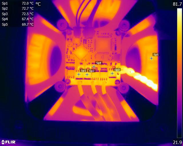 To see where all the temperature drop was coming from, I got a side-view of the heatspreader and motor mount assembly. Point Sp3 is on the side of the motor mount, point Sp2 is on the side of the heatspreader, Sp1 is the hot FET, and Sp4 and 5 are the cooler FETs. This is after running for several minutes continuously at 30 A