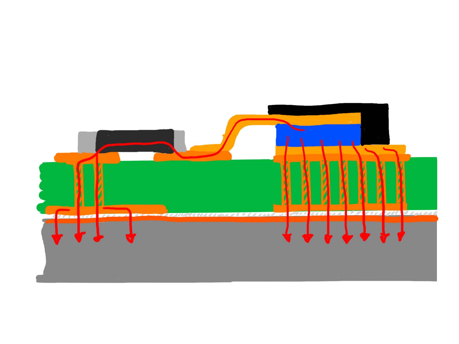 First, the high-side FETs, which are the coolest. Labeled stack-up on the left, main heat conduction path on the right. The vias beneath the drain tab go straight into the big V+ plane on the bottom, which is copper, so super thermally conductive in the plane. This effectively increases the area which conducts through to the heatspreader.