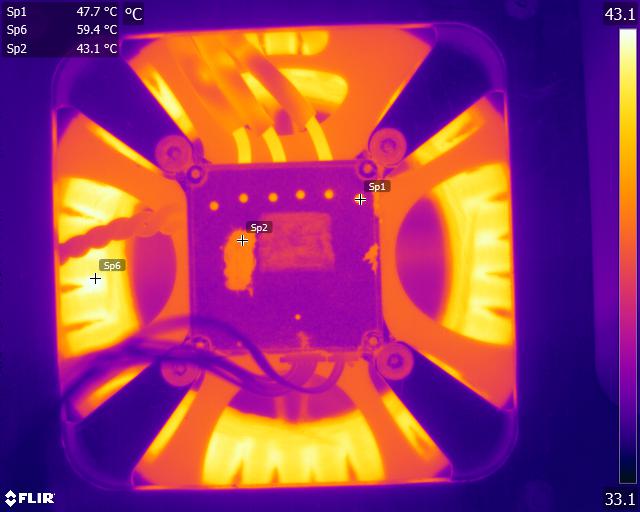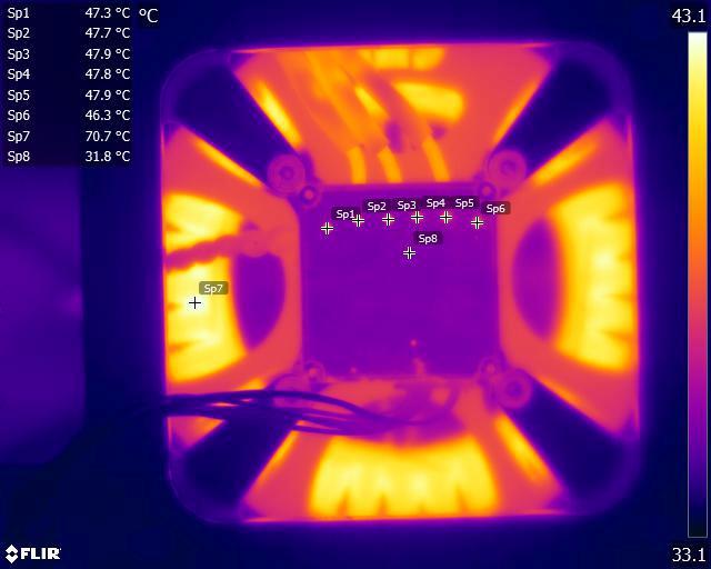 Here's an example image You can see the transistors clearly through the holes. The bright spot on the cover where point Sp2 is is where I applied some matte black paint to get the emissivity of the aluminum cover closer to 1.