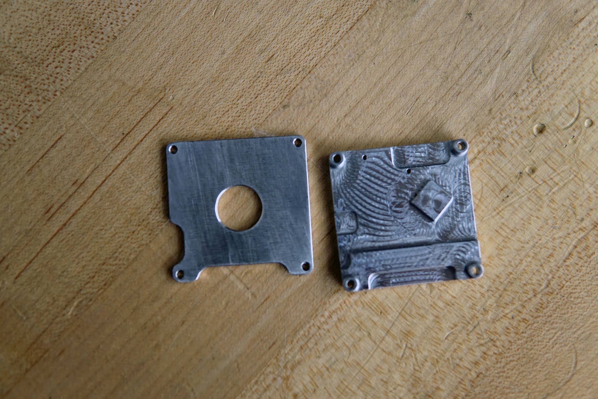 In the picture below, the heatspreader is on the left, and cover on the right: The bar across the bottom sits on top of the FETS, the square in the middle sits above the DRV chip. I left a 0.1mm gap between the FET-bar and the top of the FET package, which gets filled by some .5mm thermal pad. This allows for some variation in the height of the transistors once they're soldered down, and the compression of the thermal pad means there's a fair amount of pressure pushing down on the top of each transistor.