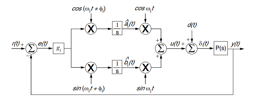 Here's a block diagram of how AFC works, taken from the paper "Adaptive feedforward cancellation viewed from an oscillator amplitude control perspective". \(r(t)\) is the reference (current, in my case), and \(d(t)\) is a disturbance (back-emf harmonics, in my case), and \(y(t)\) is the control effort (D or Q voltage in my case).