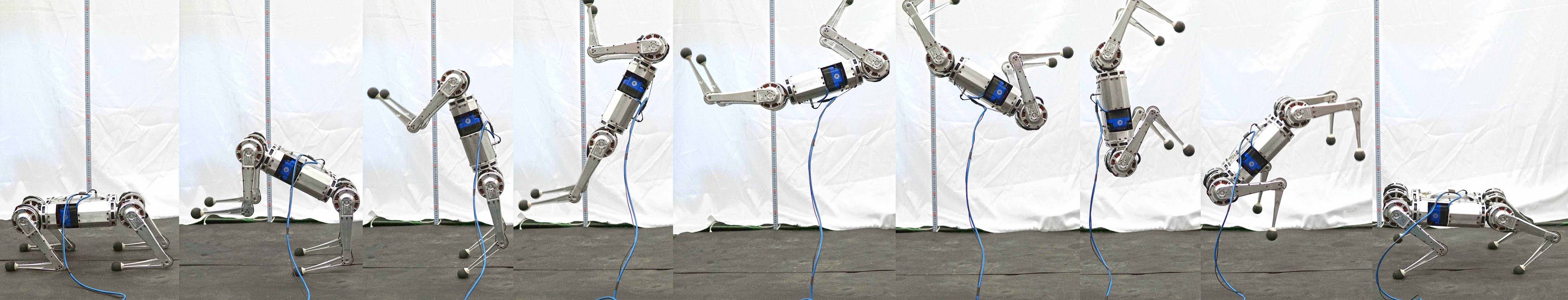 The design principles behind the robot are very similar to Cheetah 3: High torque electric density motors, low gear ratio, efficient transmissions to minimize friction and reflected inertia, lightweight legs with motors placed to minimize leg inertia. A few things are different, though. Mini Cheetah has 12 identical modular actuators with built-in motor control, gearbox, and support structure. The electric motors are off-the-shelf and very cheap, unlike Cheetah 3's custom designed motors. Mini Cheetah has even more range of motion than Cheetah 3 at the hip, so it's able to point it's legs completely sideways. This means that it should be possible to make the robot land feet-first regardless of what orientation it falls in.