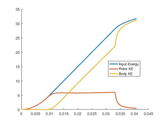 Plotting the kinetic energies of the actuator and mass, vs the input energy, \(\int{\tau\omega}\), you can clearly see energy trading off between the actuator and mass. No energy is lost - the kinetic energies at the end are equal to the input energy: