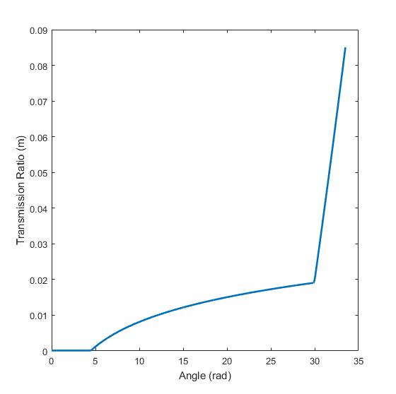 I roughly hand-designed a varying transmission ratio to do this. At the beginning, there's a constant, small transmission ratio. Then it switches to a logarithmic curve - A log curve results in constant power output at constant actuator angular velocity, although I'm not going to justify that here. At the end, it rapidly increases to slow down the actuator.
