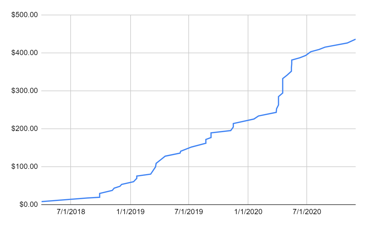 For the last few years, I've been tracking my album purchases as well as how many total song plays I have. Here's what my cumulative music spending looks like since April 2018: