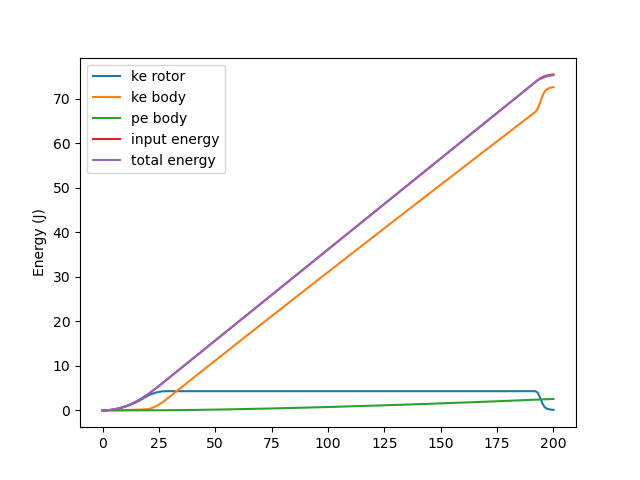 Here you can see how the kinetic energy of the mass, of the rotor inertia, and the potential energy of the mass trade off over the trajectory: