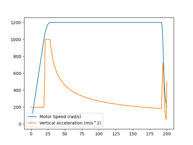1 2 3 4 5 6 7 8 | N = 200 # number of trajectory intervals m = .75 # mass (kg) j_rotor = 6e-6 # rotor inertia (kg*m^2) l_leg = .35 # leg length (m) tau = 1.6 # motor torque (N-m) w_max = 1200 # max motor speed (rad/s) g = 9.8 # gravity (m/s^2) |