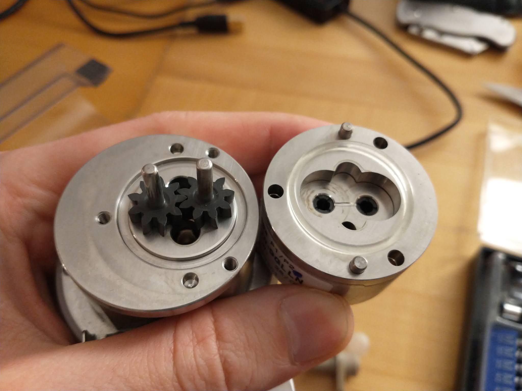 Using a leftover pendulum motor controller, Moog brushless motor scavenged from the Media Lab years ago, and gear pump from ebay to play with closed-loop pressure control. Pressure plotted on the computer screen (and shown on the gauge), pressure setpoint stepped up and down, and a needle valve used as a variable load.