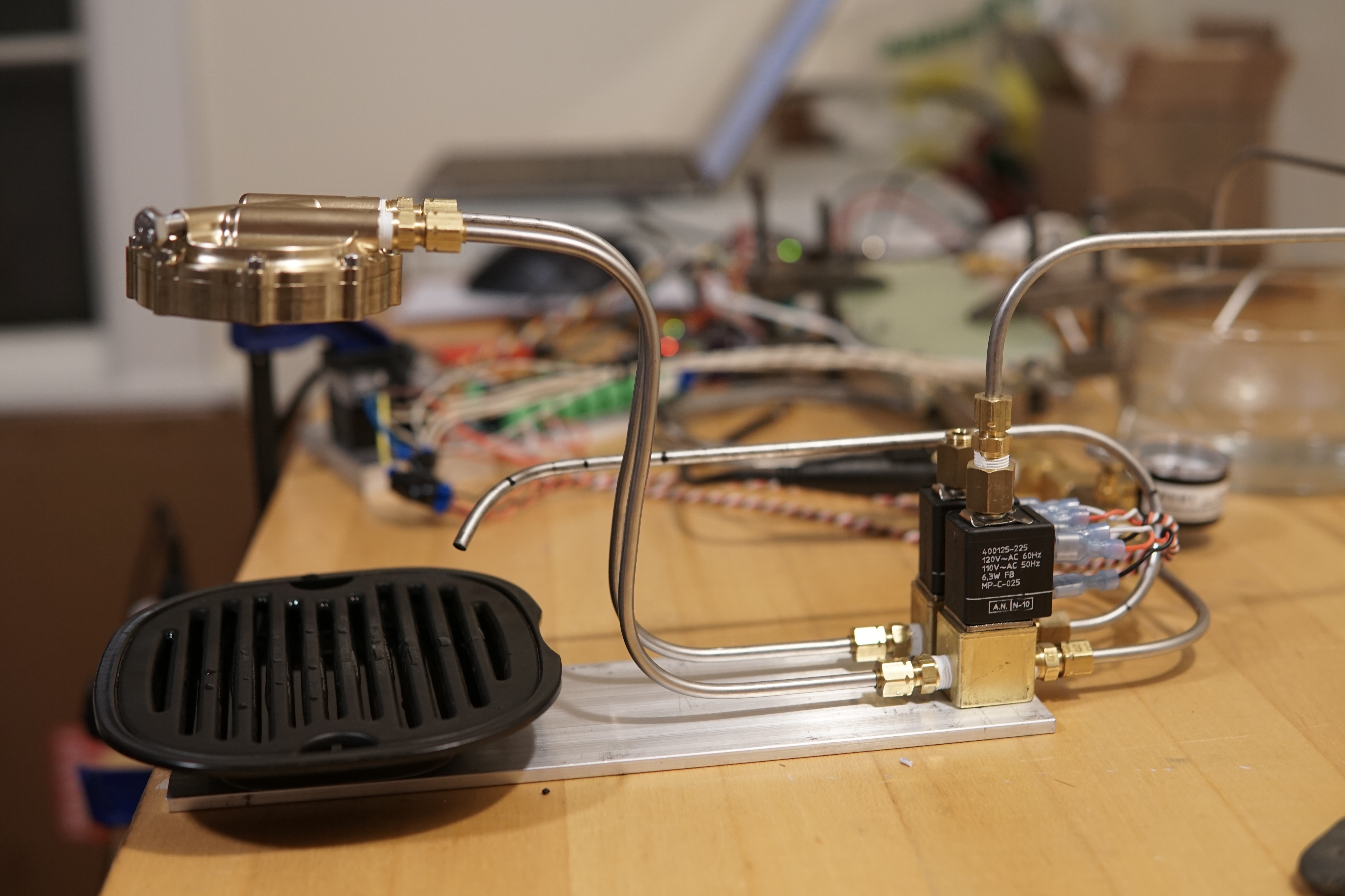 Critically with this setup, the whole tank of water doesn't have to get hot as it would in a boiler-based espresso machine. I'm hoping to get the delay between powering the machine on and pulling the first shot down to a minute or less. With a standard 15A mains outlet, it should be possible to real-time heat over 5 mL/s of water from room-temperature to espresso temperature, so main delay is in getting the thermal mass of the heater up to temperature.