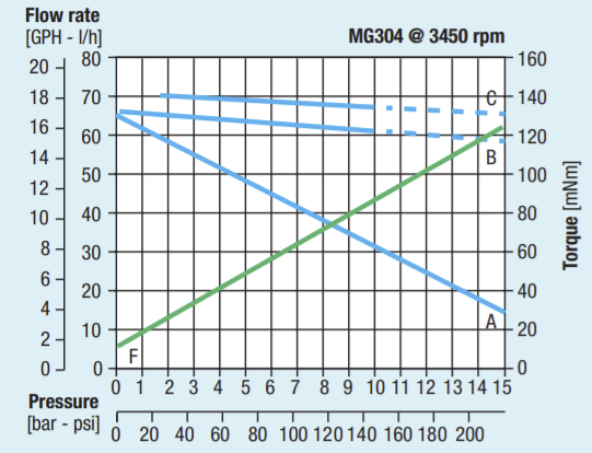 The main downside of gear pumps is leakage - which you can see in the pressure vs flow plot. Gear pumps "seal" by having very close tolerances between the tooth tips and faces of the gears and the pump cavity, so some fluid leaks through these gaps. For this pump it's very linear with pressure - at a constant input speed (which would be a constant flow if there were no leakage), output flow drops off linearly with pressure drop across the pump.