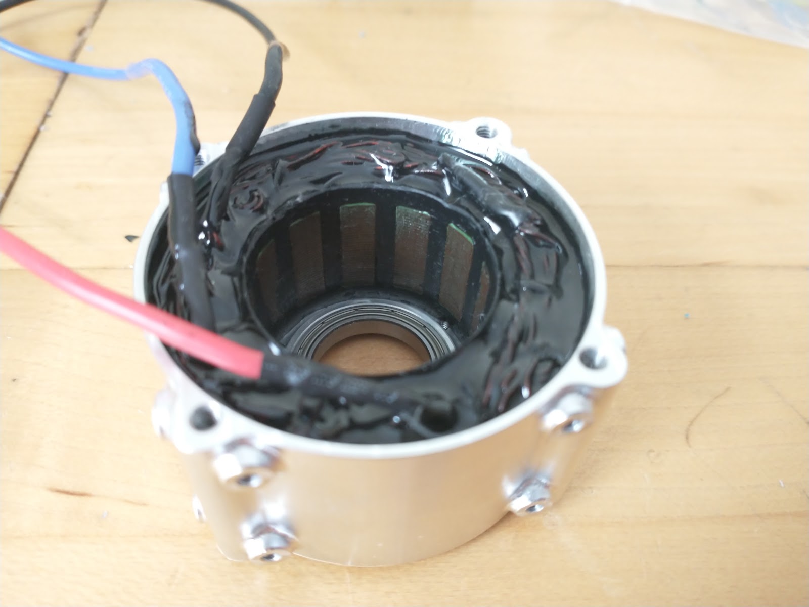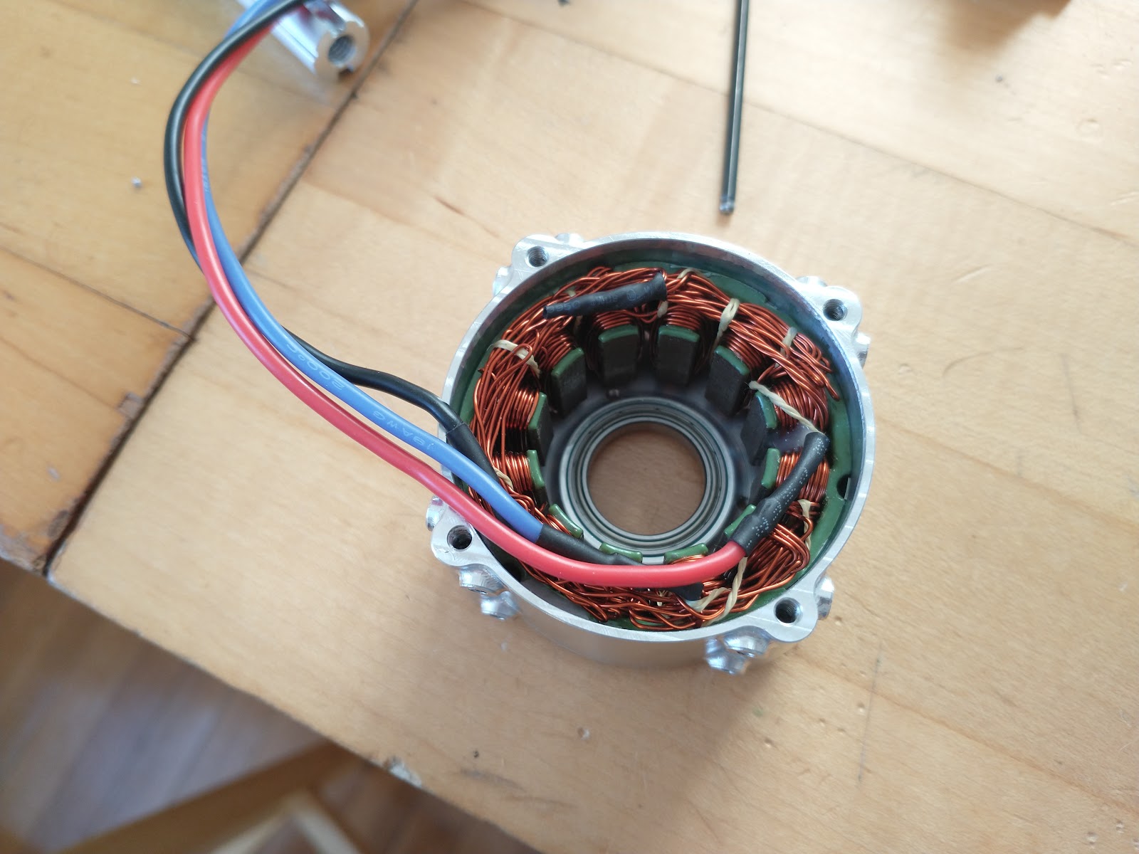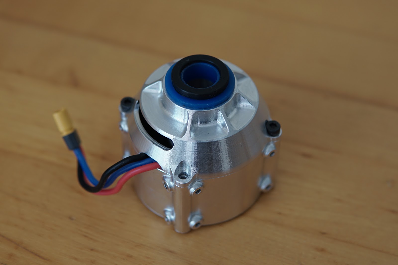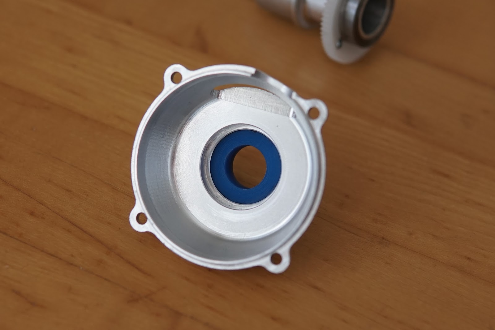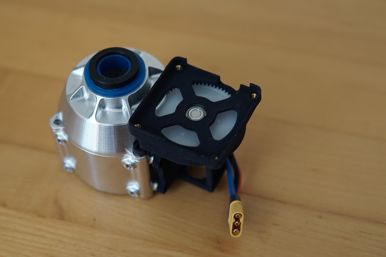 Here's the motor drive mount attached. The motor drive mount is an HP MJF 3d-printed part. At the center is a pair of bearings fan aluminum shaft with a tiny diametric magnet pressed into the end, for sensing the rotor position. The spur gear in the motor drive mount meshes with the spur gear on the rotor, as seen two pictures down.