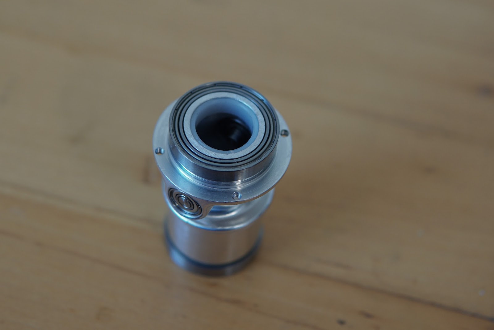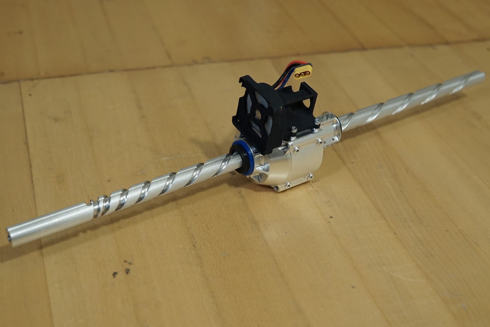 At the center of the mechanism is the varying pitch screw (or barrel cam). The screw passes through a "nut" with two cam followers, which drives the screw axially as it turns. The nut directly supports the rotor of an electric motor (specifically a T-motor RI50). The screw passes through the center of the motor's stator, and is constrained by a guide bushing at the top, and 3 sets of guide rollers at the bottom, which roll in axial grooves on the screw and react the motor torque.