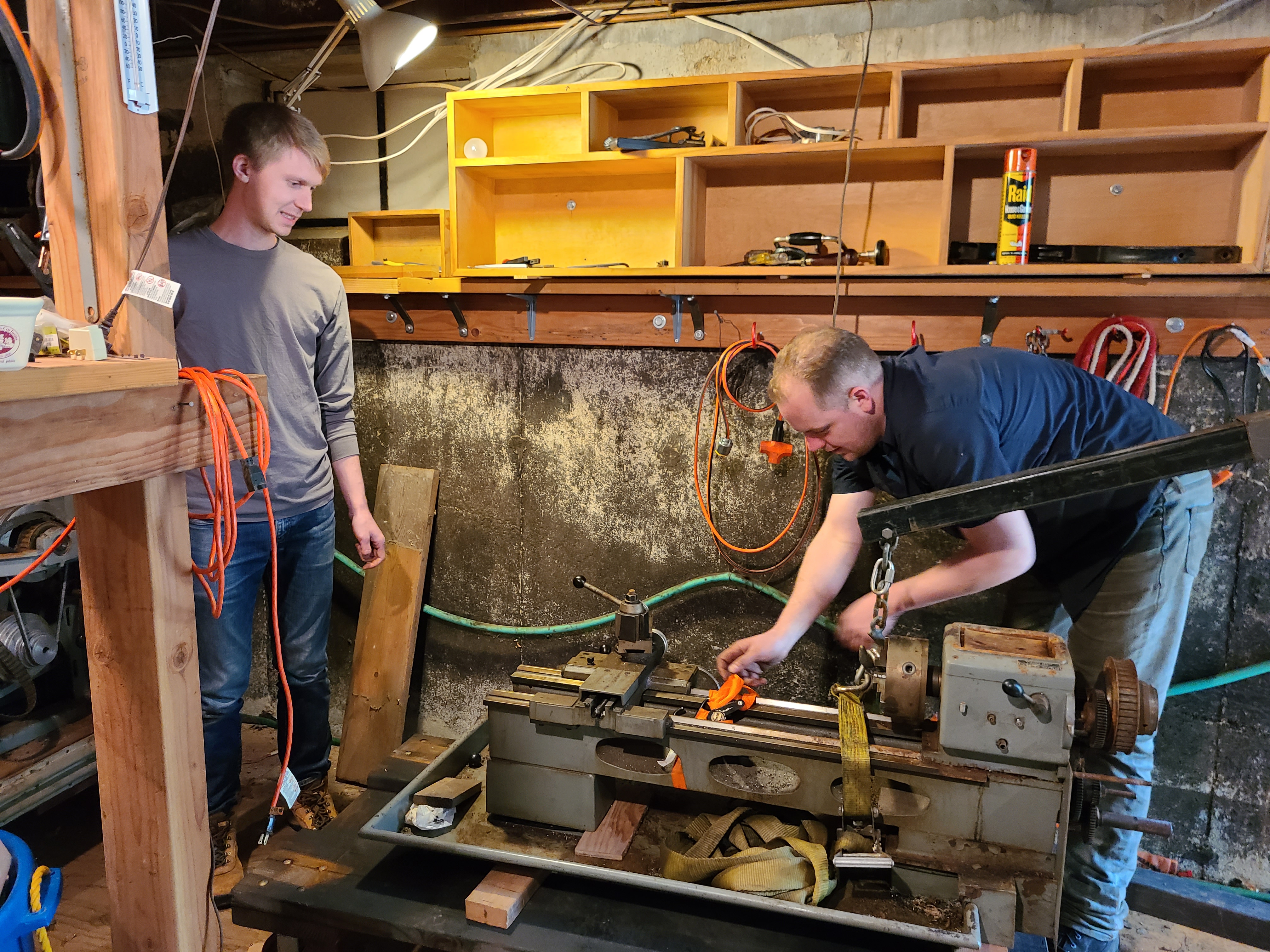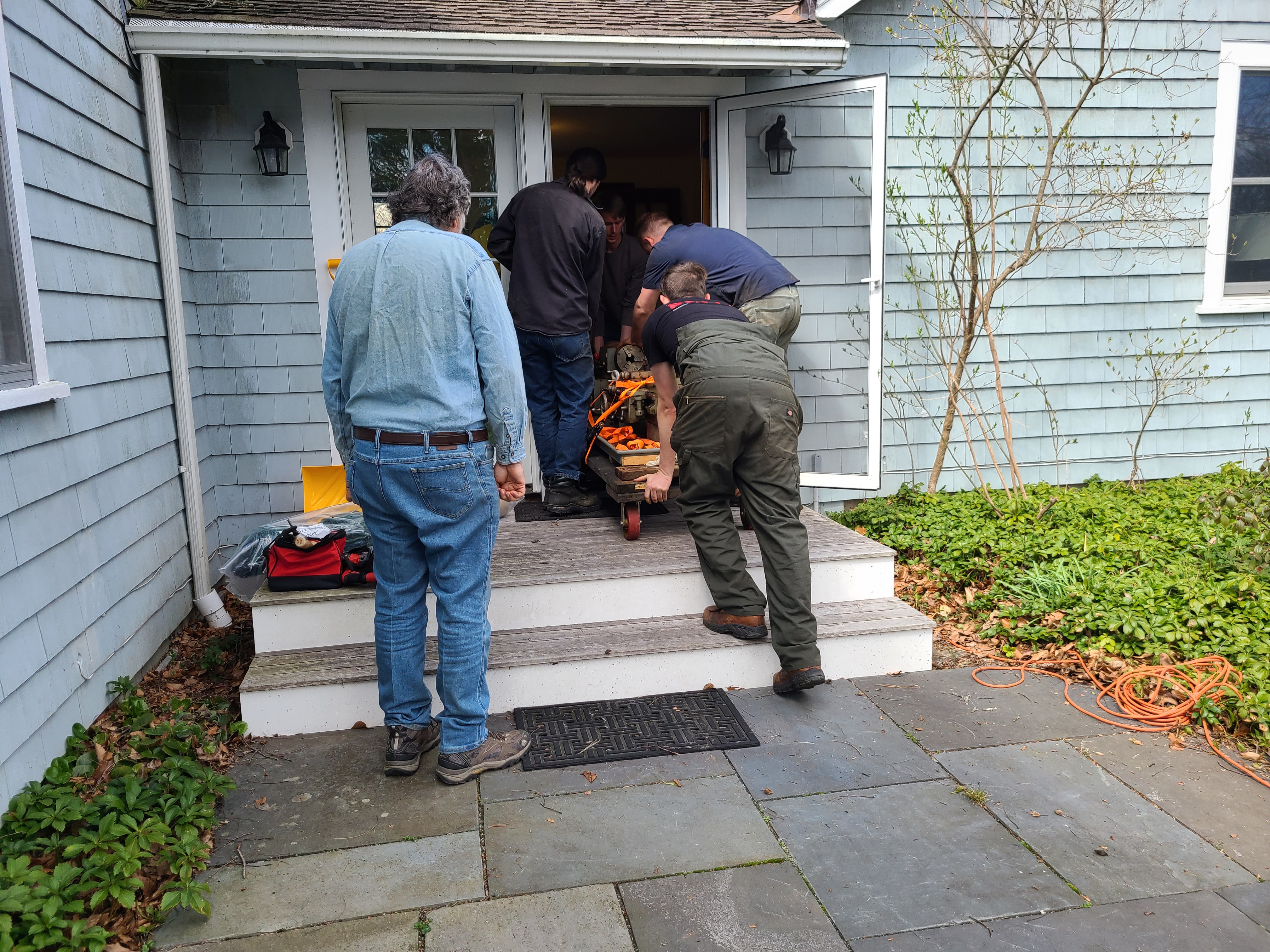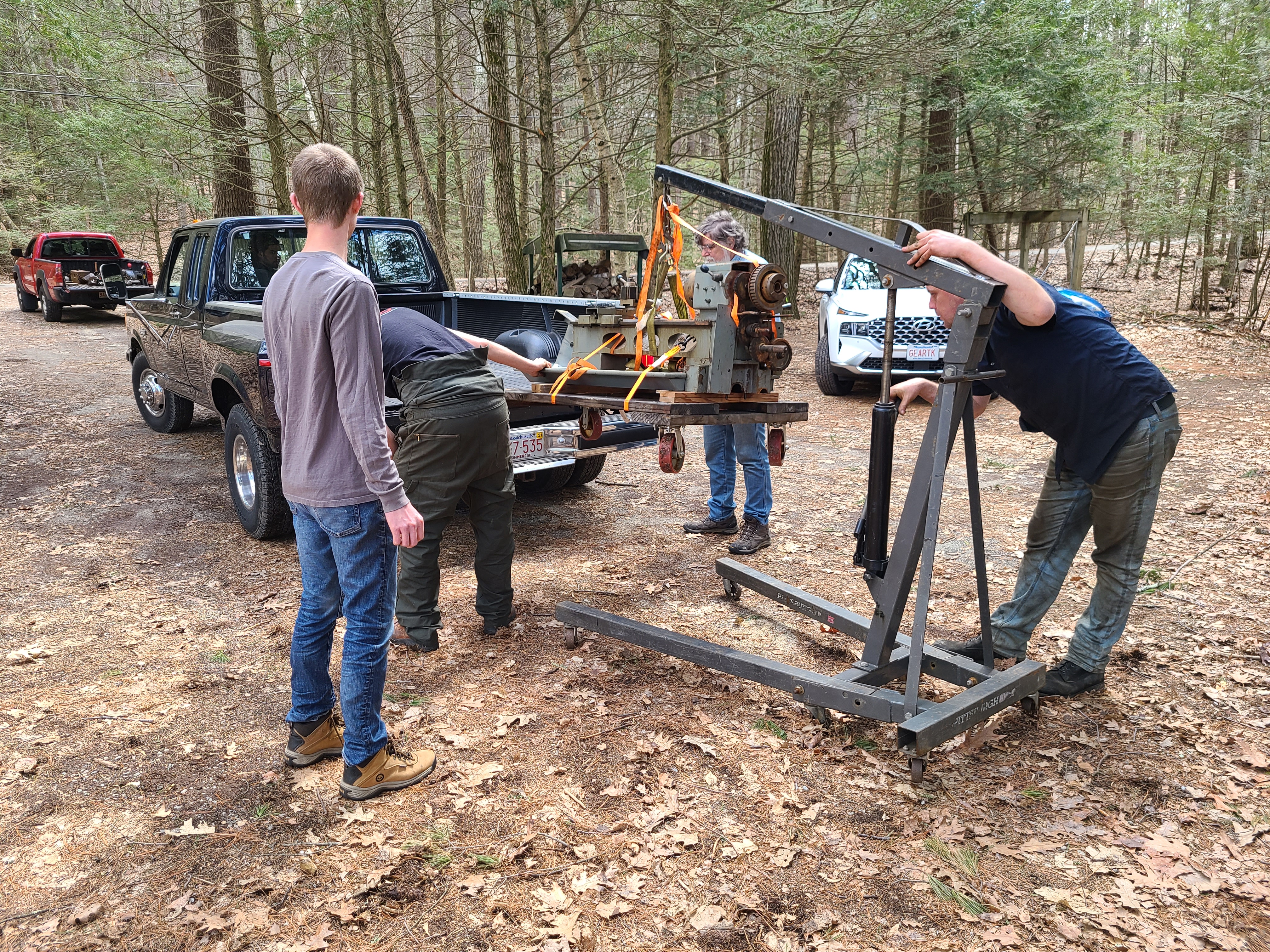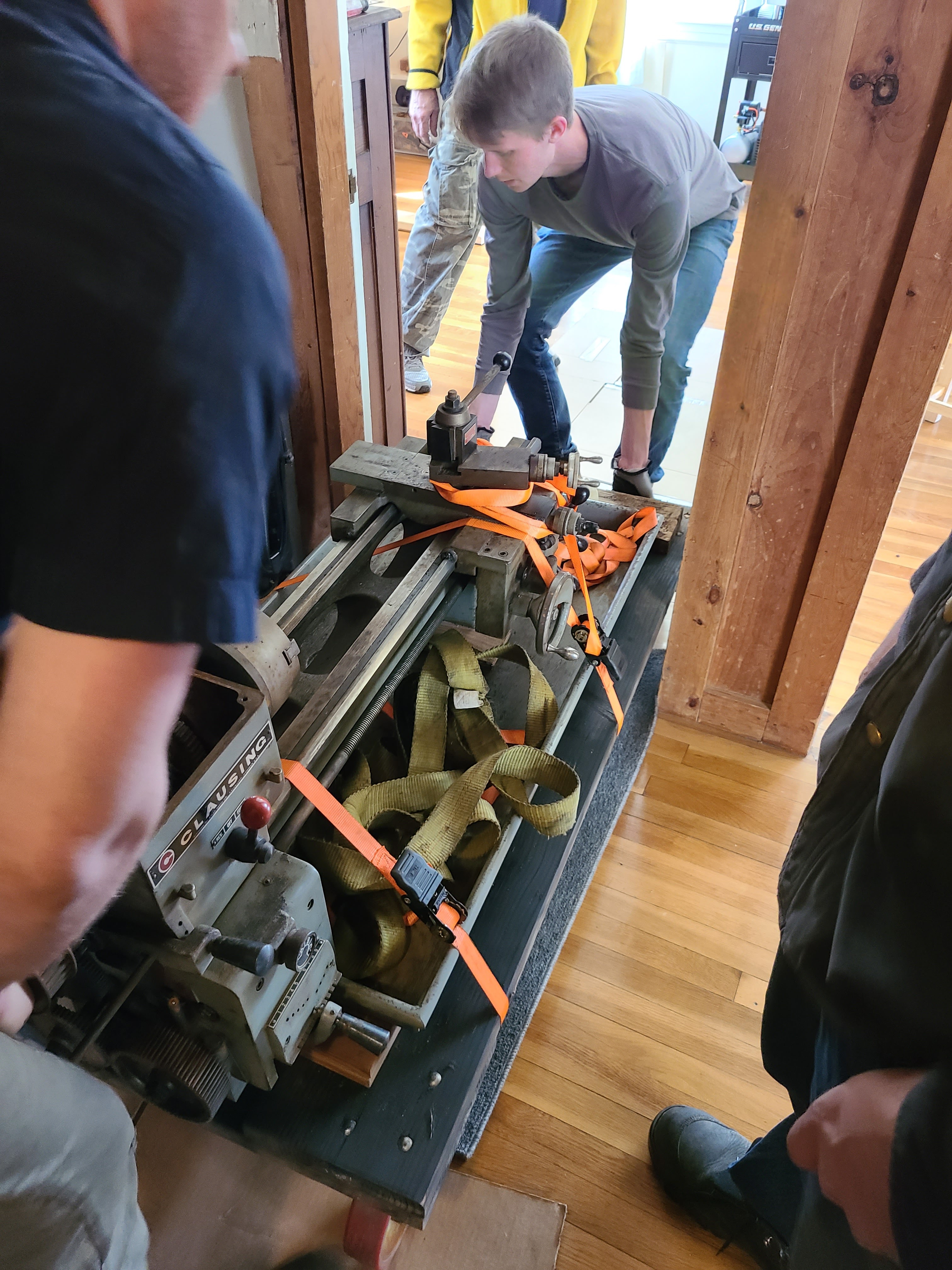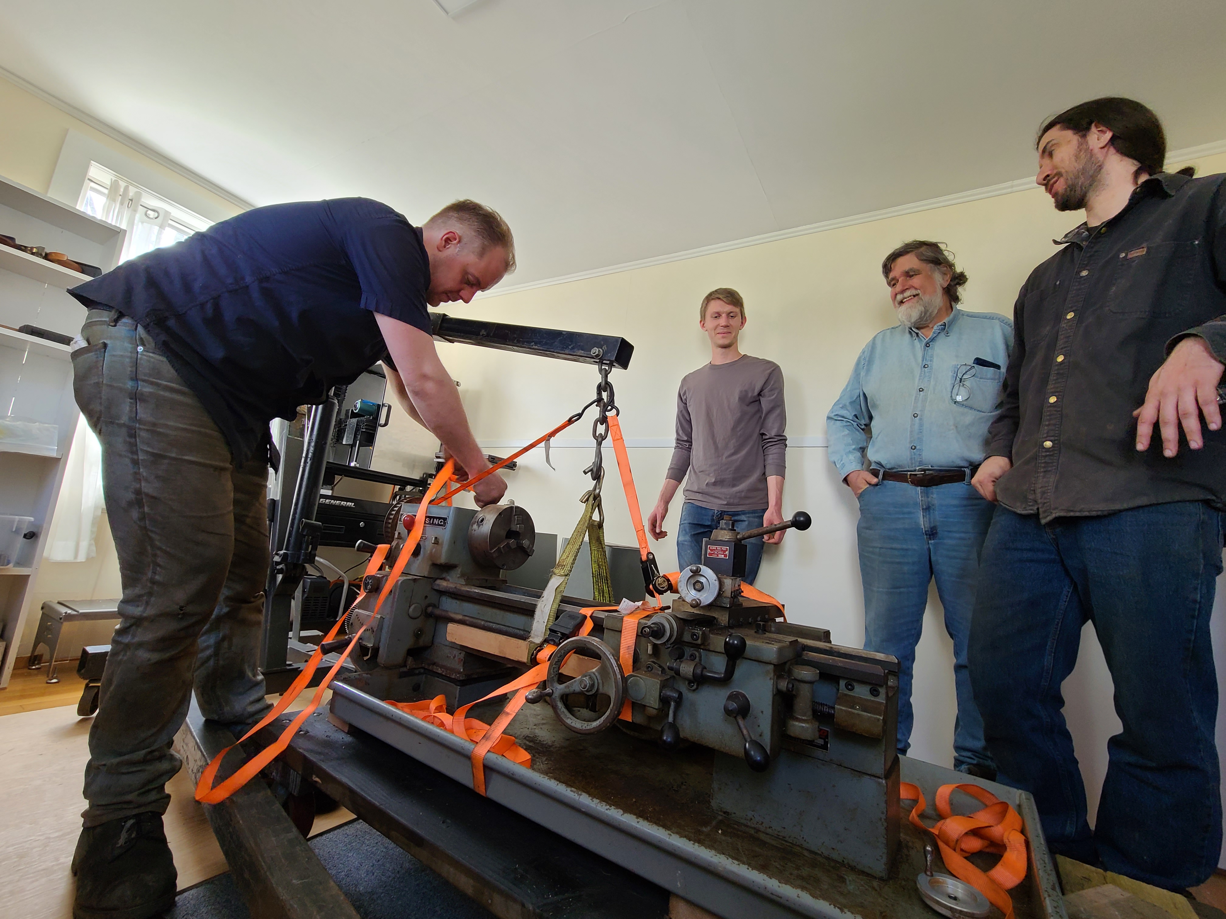 Andrew, who have moved many tons of machine tools over the last several years (probably all of which are much heavier than the 800-ish pounds this lathe is), plus Austin, Aaron, and myself.