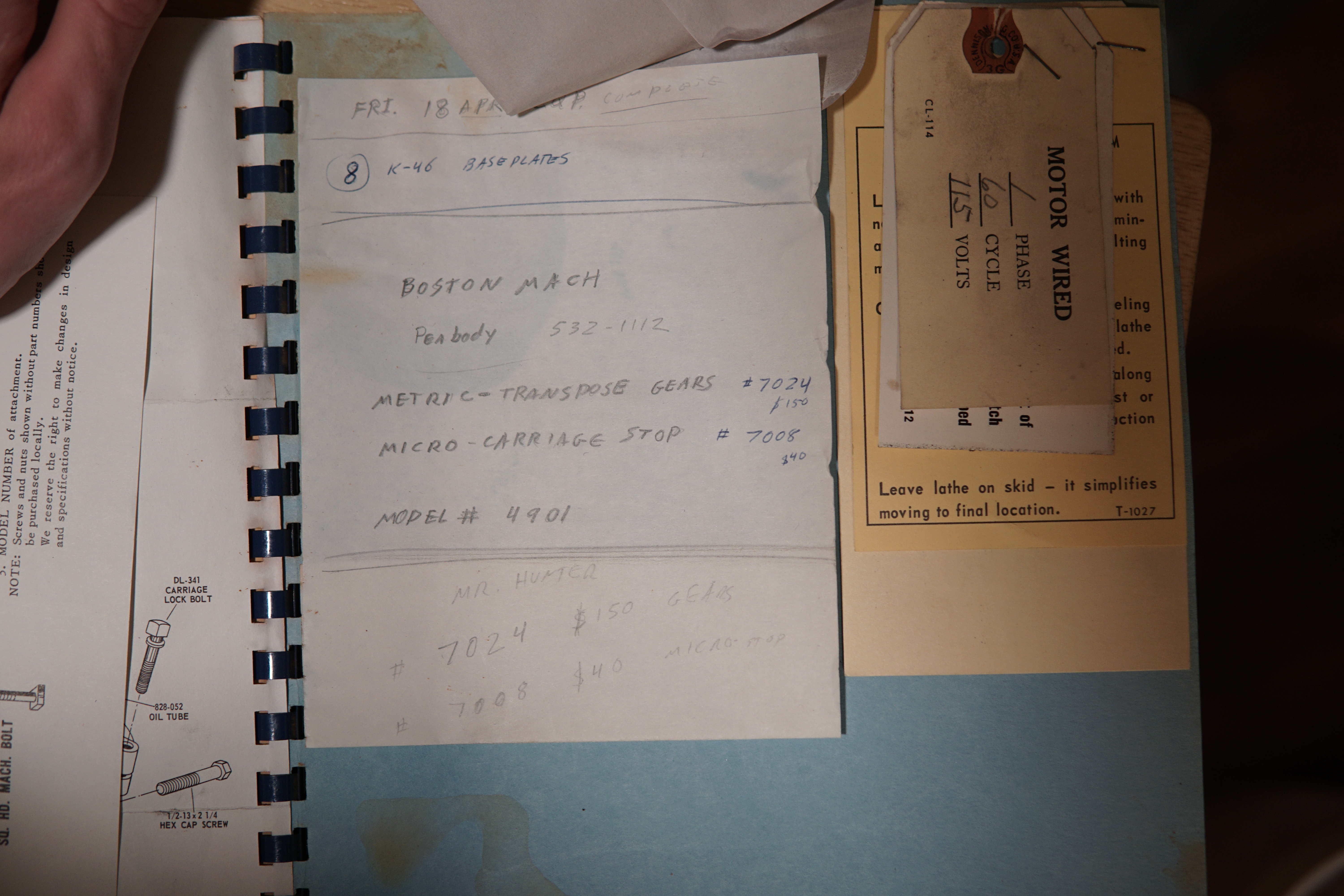 The lathe also came with the original paper manual, factory inspection report, and accessory manuals: