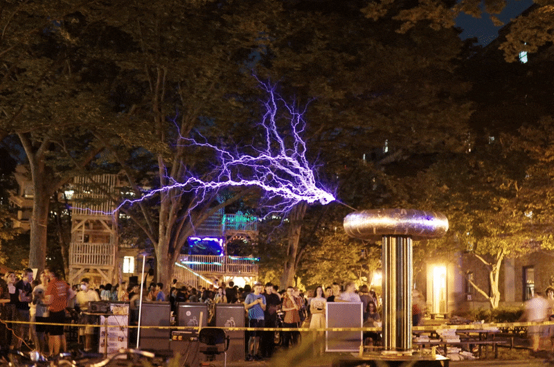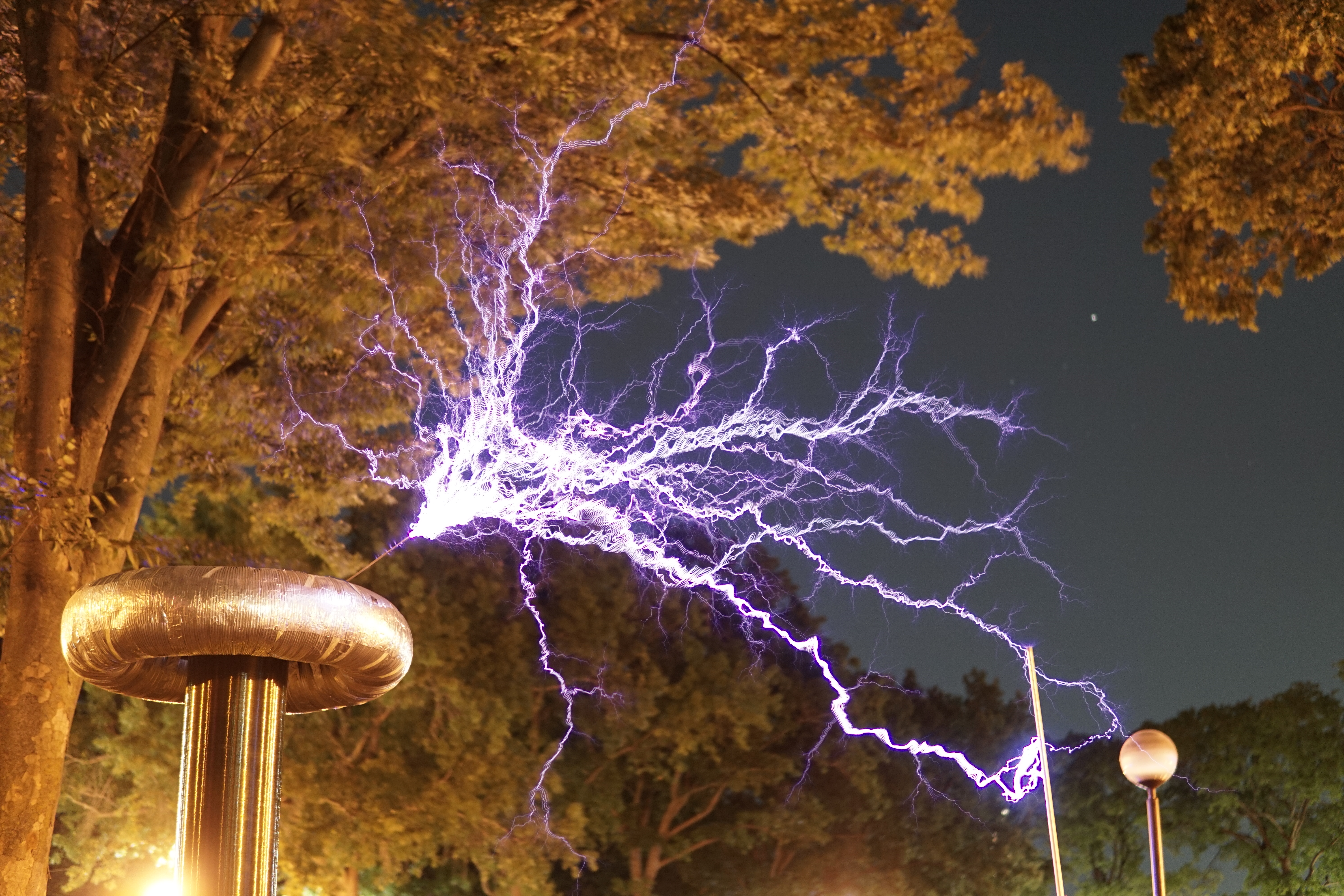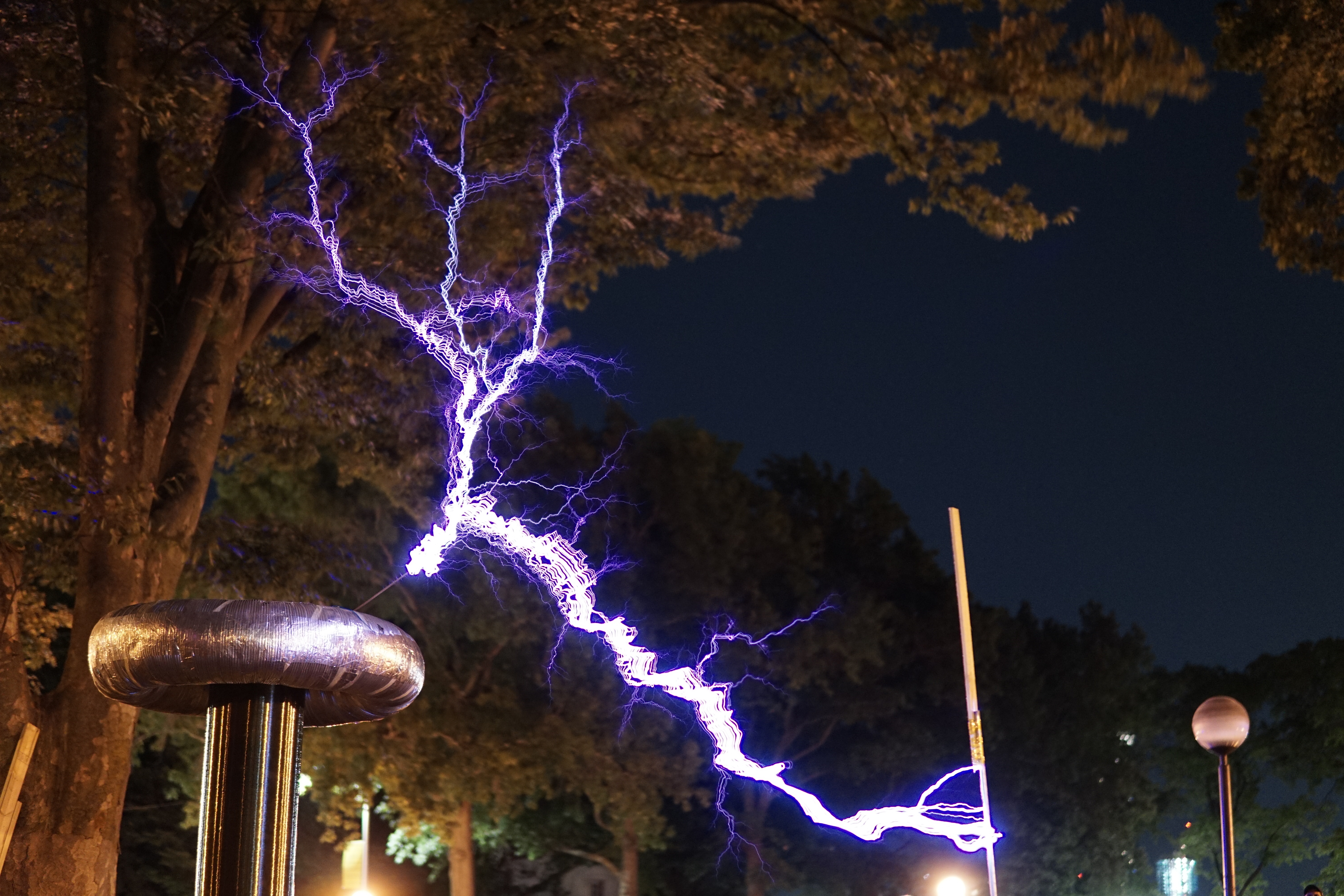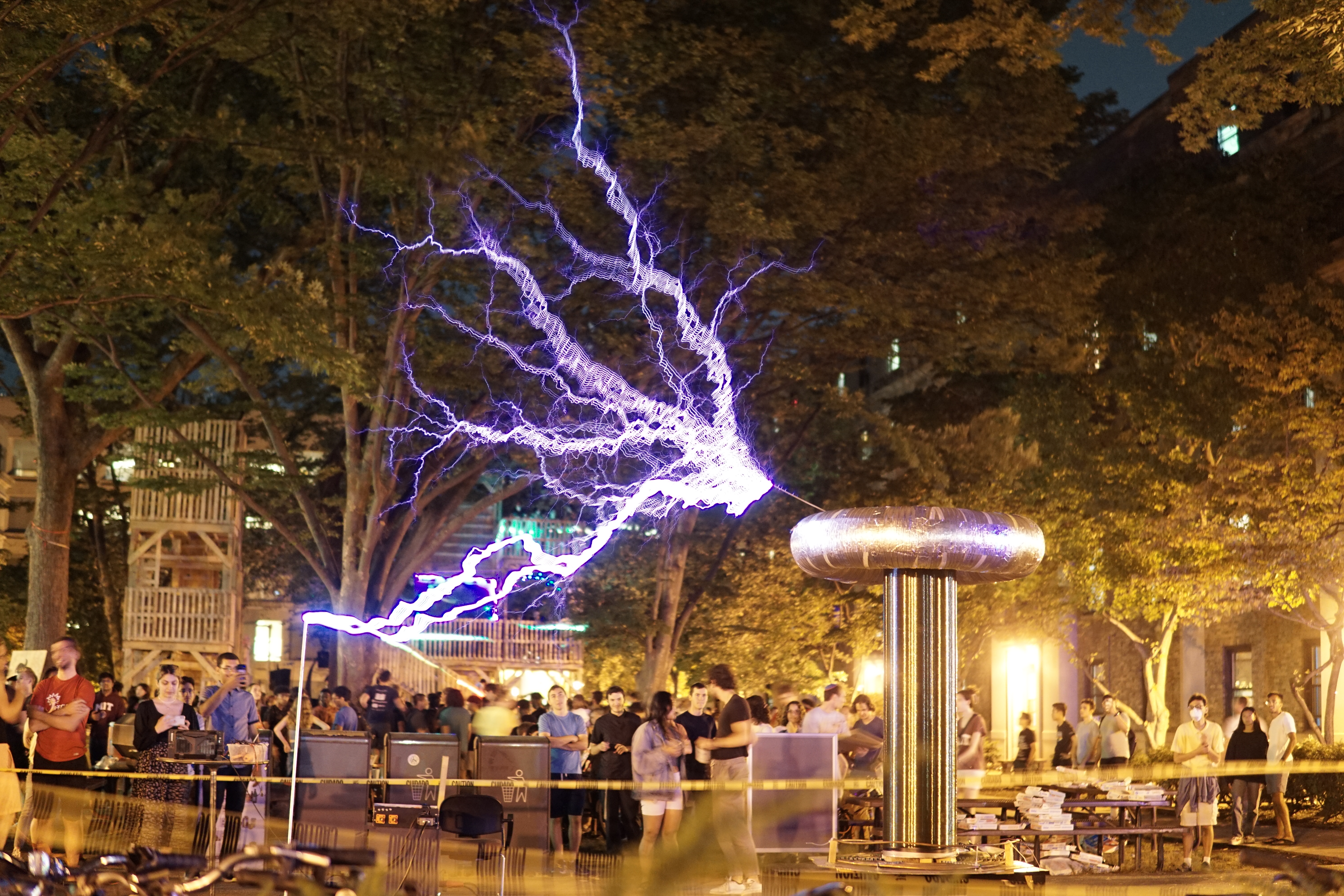 Once again Mike's tesla coil worked flawlessly - at least until someone tripped over the extension cord powering a fan cooling the primary capacitor bank. We didn't notice until the capacitor bank burst into flames.