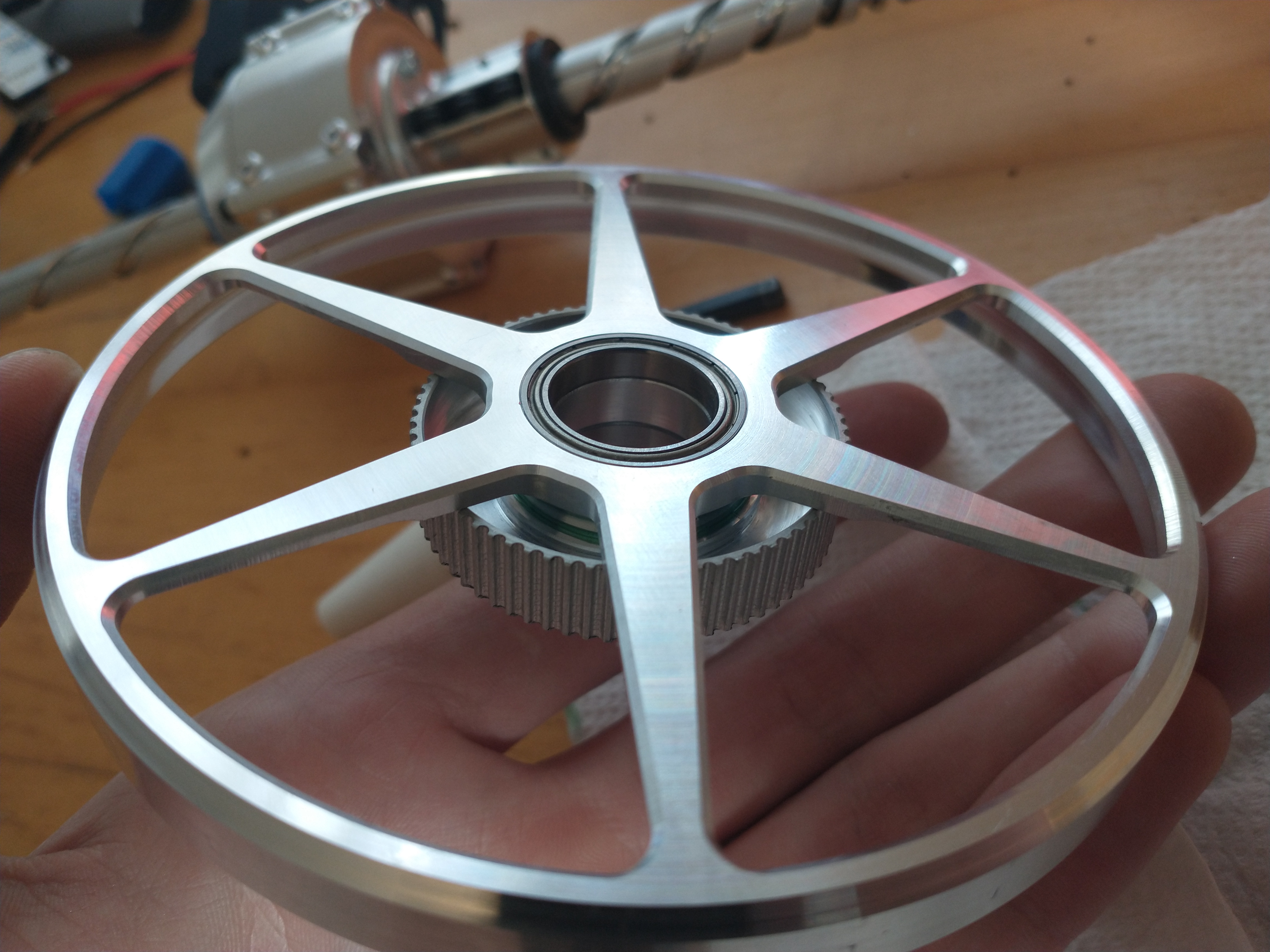 Dont get it completly yet. Where is the belt going through? Is the pully fixed to the reaction wheel? How? What is the green stuff around the inner ring of the pully? Why is the material not removed on both sides of the pully, will it not defelect to one side when pretension is applied (like a harmonic drive)? Why are there no side guards on the pully?